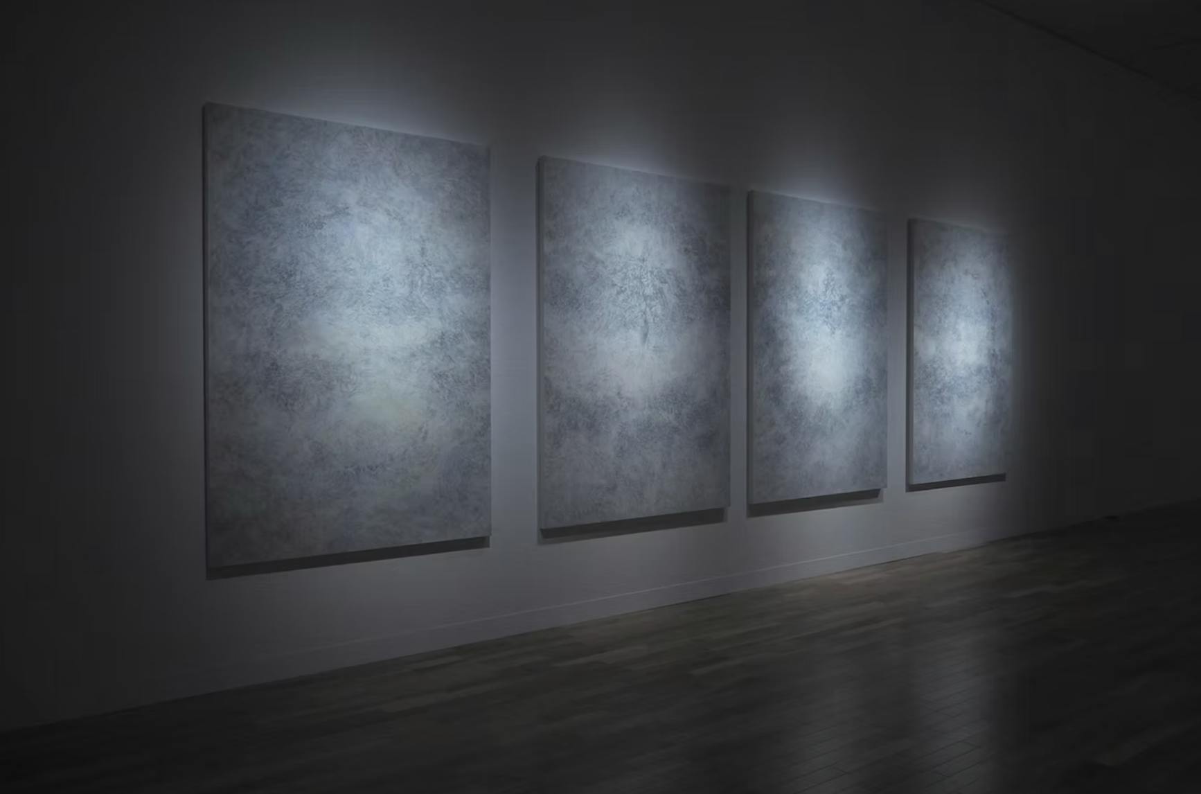 西川は自然と人間の境界に漂う不可視のものを捉える方法を模索しながらテキスタイルと絵画を制作しています。「一度滅びを見たものが放つ新たな美しさ」を表現することを一貫して追い求めてきた作者は、聖骸布の存在をきっかけに花を埋葬する制作方法に辿り着きました。育てた花を写生した後、布に包み土に埋葬。数ヶ月後出土した布には花の痕跡が残り、それを”自然界の言語”と見立て、雨、霧といった自然現象の写生と組み合わせ岩絵具で描いています。