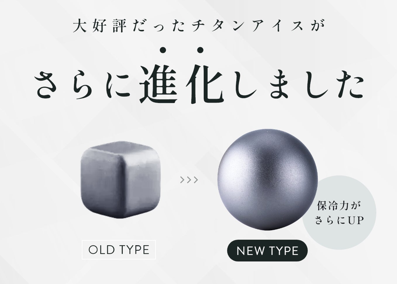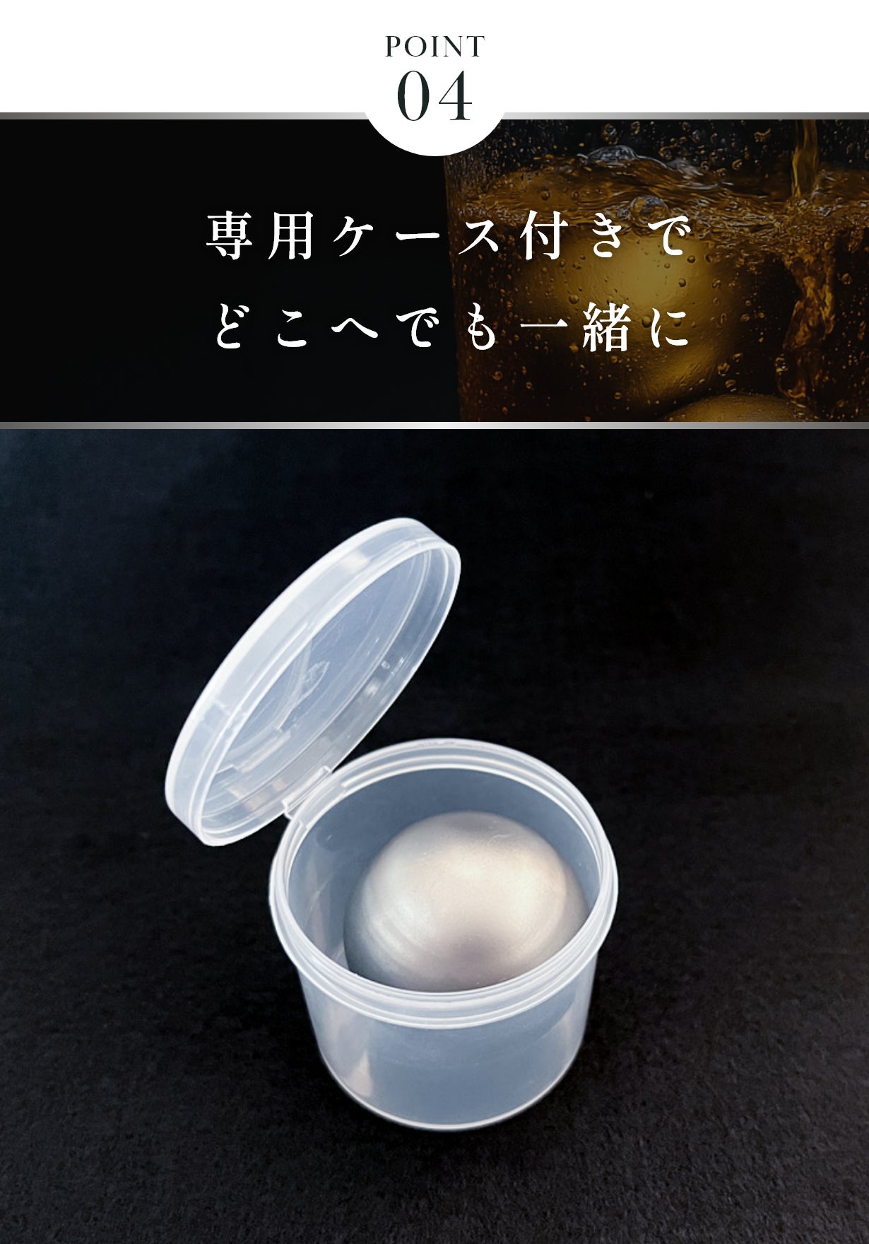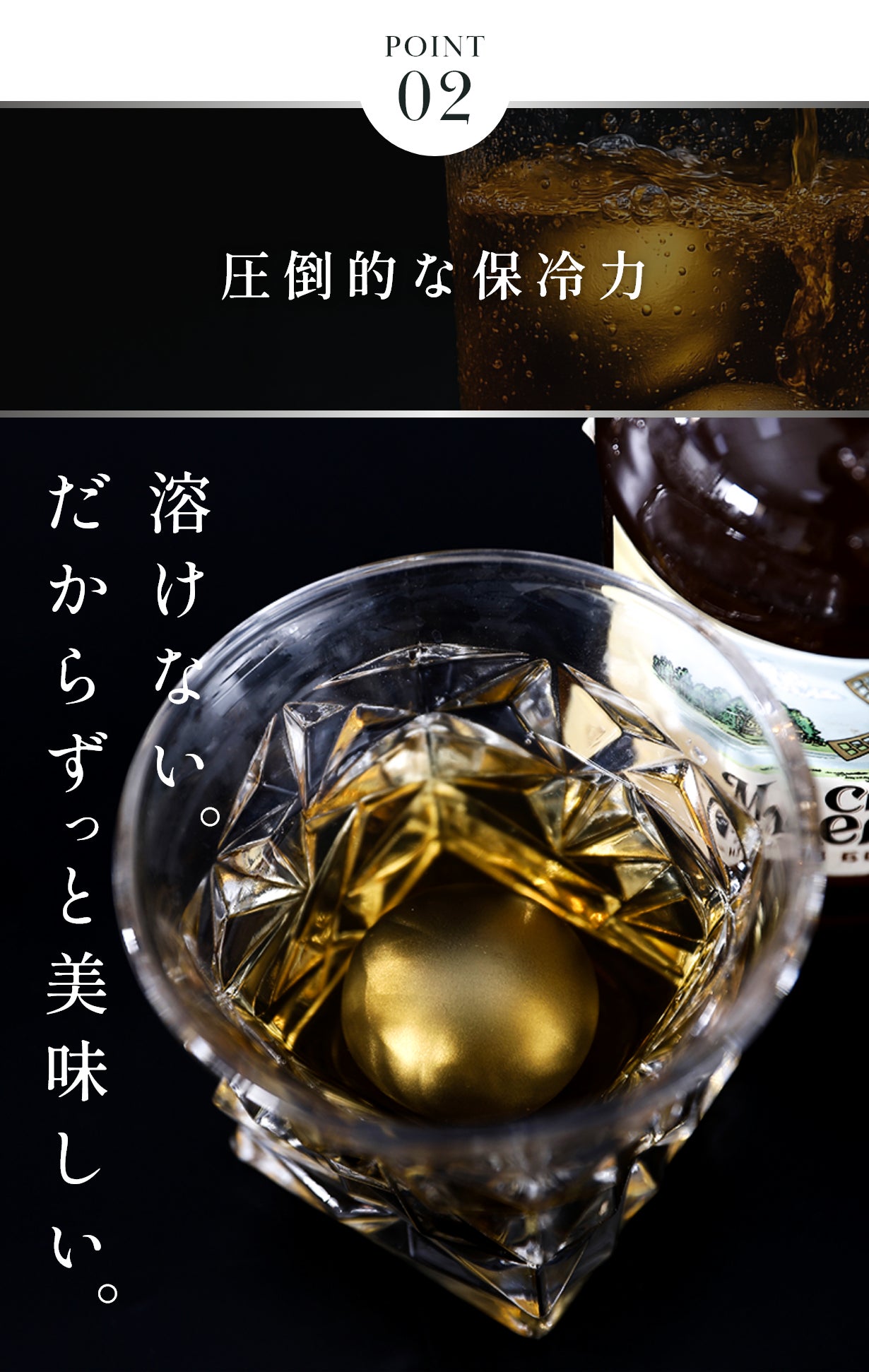 新作では、形状を従来のキューブ型からなめらかなボール型に変更。これによりグラスとの接触面積が最適化され、冷却効率がアップ。また、サイズをやや大きめに設計することで、より長時間の保冷が可能になりました。