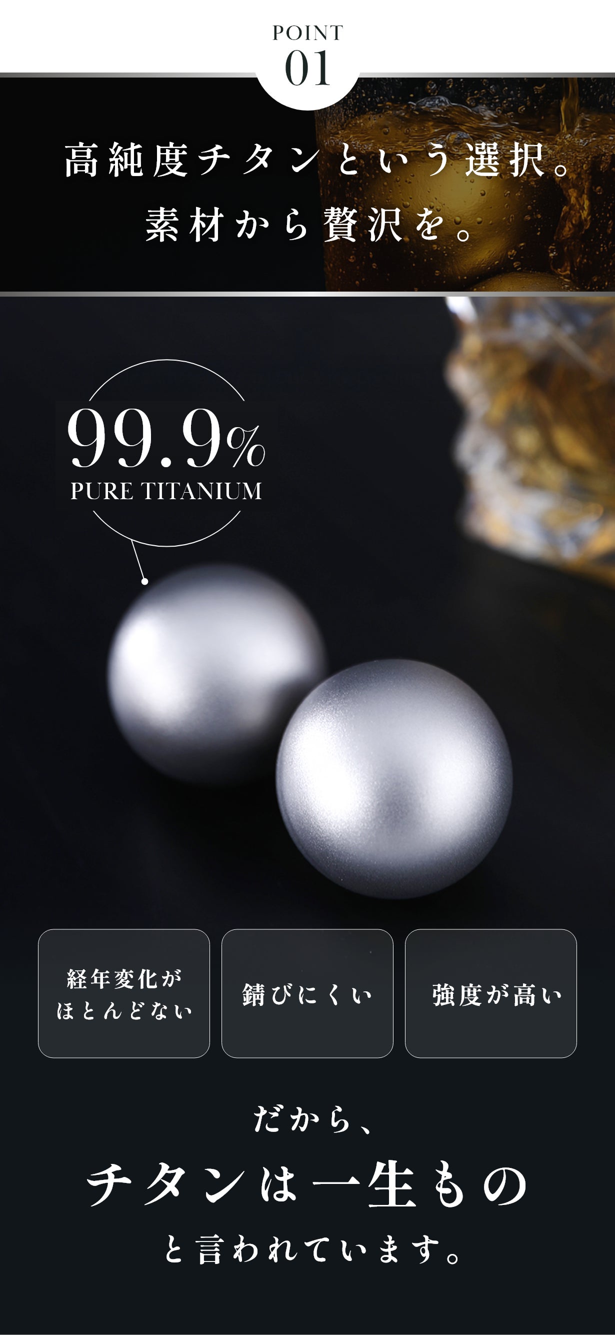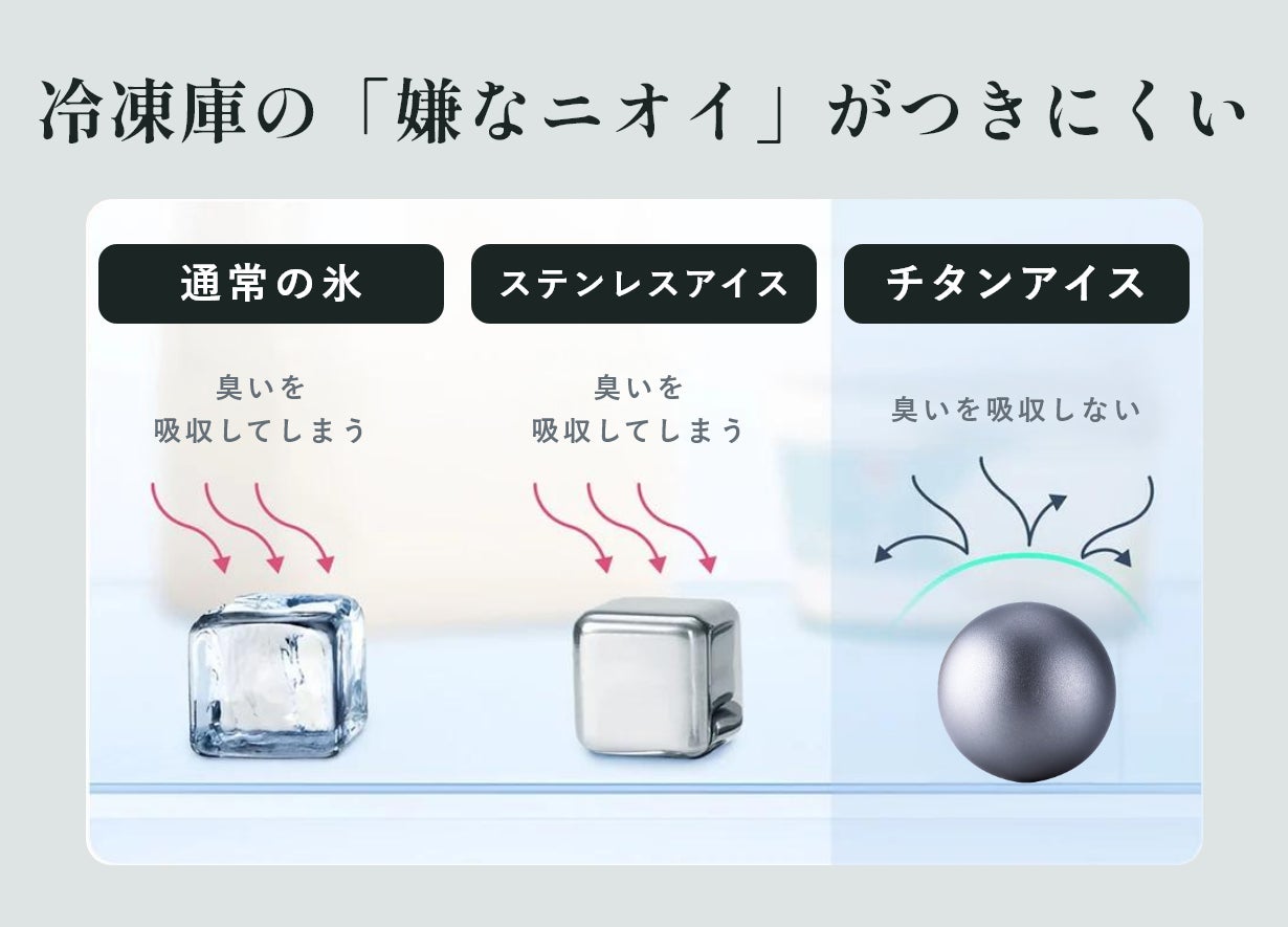 ウイスキーやワインの繊細な香りを楽しむには、「香りを邪魔しないこと」がとても大切です。チタンは、他の金属と比べて極めて臭い移りが少ないという特性を持っています。また、製氷機のカビが氷やステンレスに付着するという問題も解決できるのも特徴の一つです。
