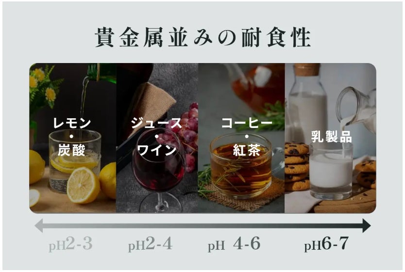 海水や酸性の環境でも腐食しない。チタンには、そんな驚異的な耐食性があります。日常的に使う飲み物の中には、酸や塩分を含むものも少なくありません。しかしこのチタンボールなら、どんな飲み物でも安心して使い続けることができます。