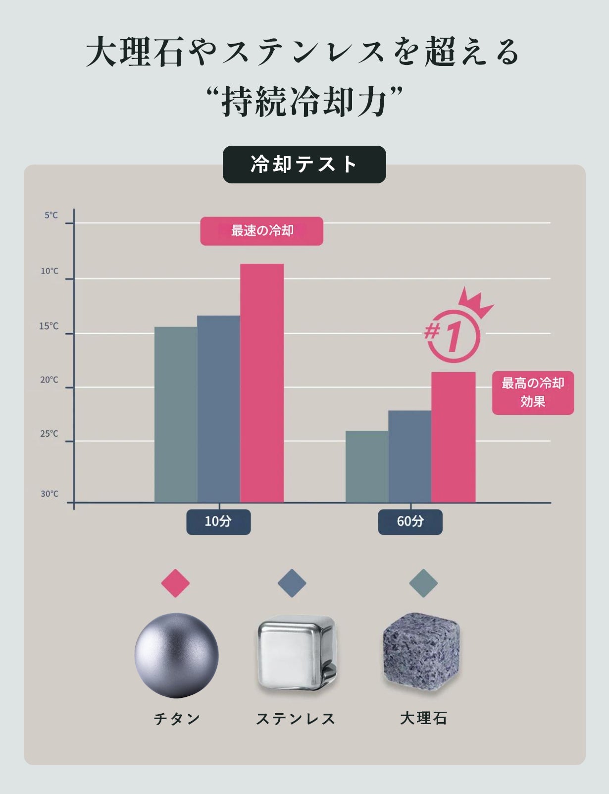 一般的な大理石製アイスやステンレス製と比べても高い冷却効果を記録し、10分後・60分後、どちらの時点でも最も低い温度をキープし、飲み物の美味しさをしっかり守っています。
