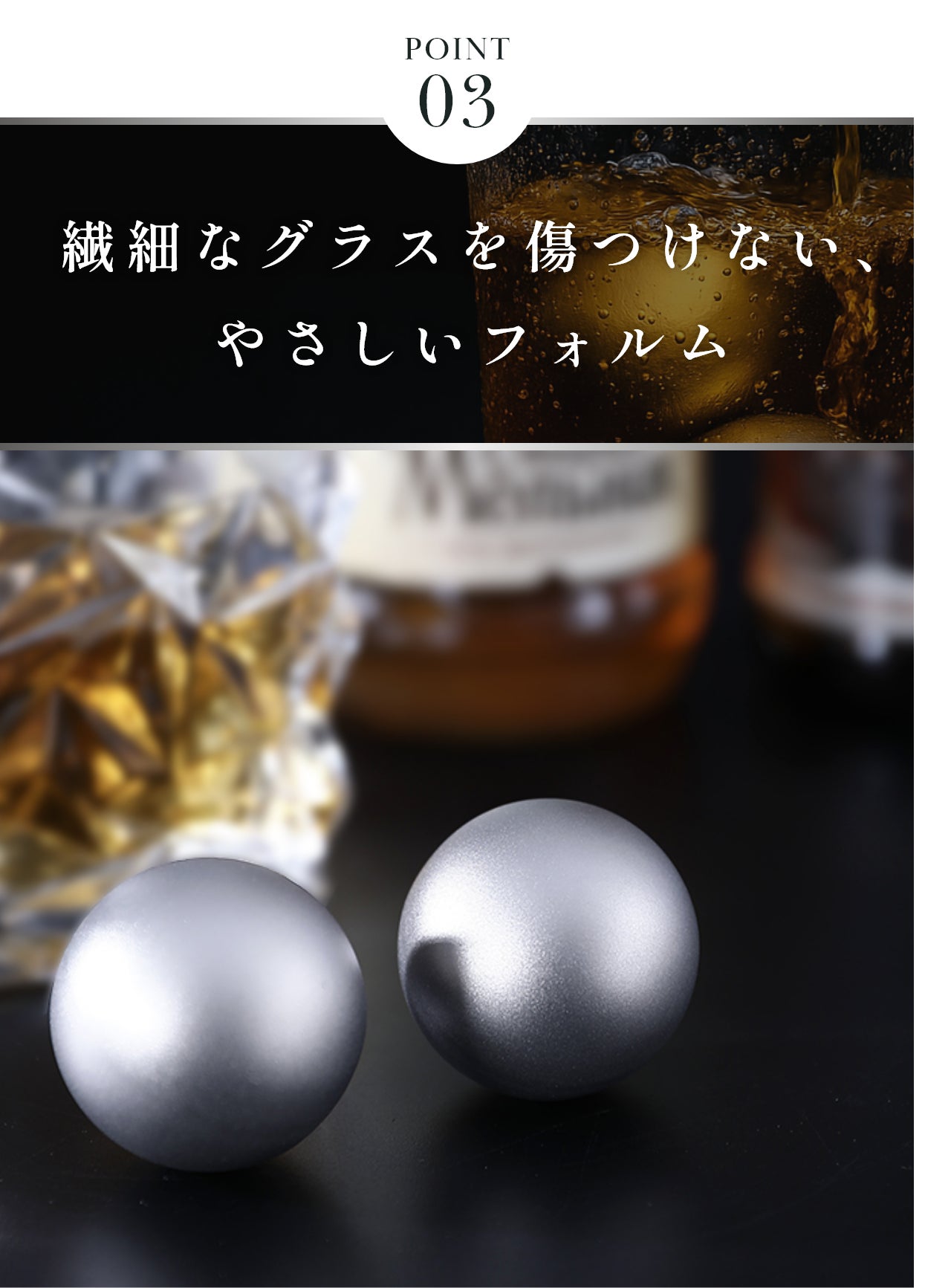新しいボール型では、そうした不安を徹底的に排除。丸みを帯びたフォルムがグラスの内面をやさしく転がり、見た目の美しさと実用性を高次元で両立させました。大切なグラスやお気に入りの酒器でも、安心してお使いいただけます。