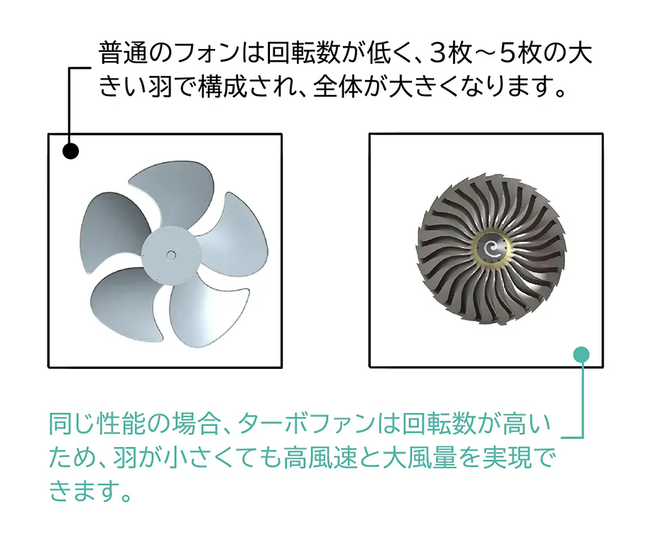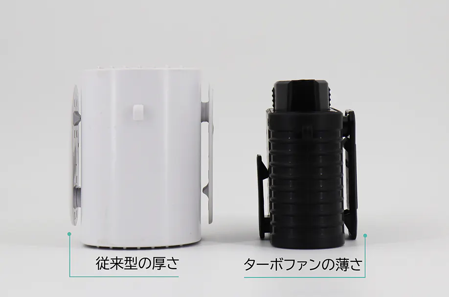 「WalkFan ultra」は13枚の羽がつたいたターボファンを採用し、高性能なのに従来型の約半分の薄さ3.5cmに圧縮できました。