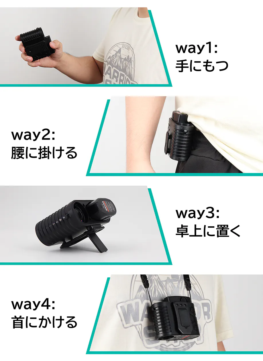 利用方法:手持ち、ウエスト、卓上、首掛け