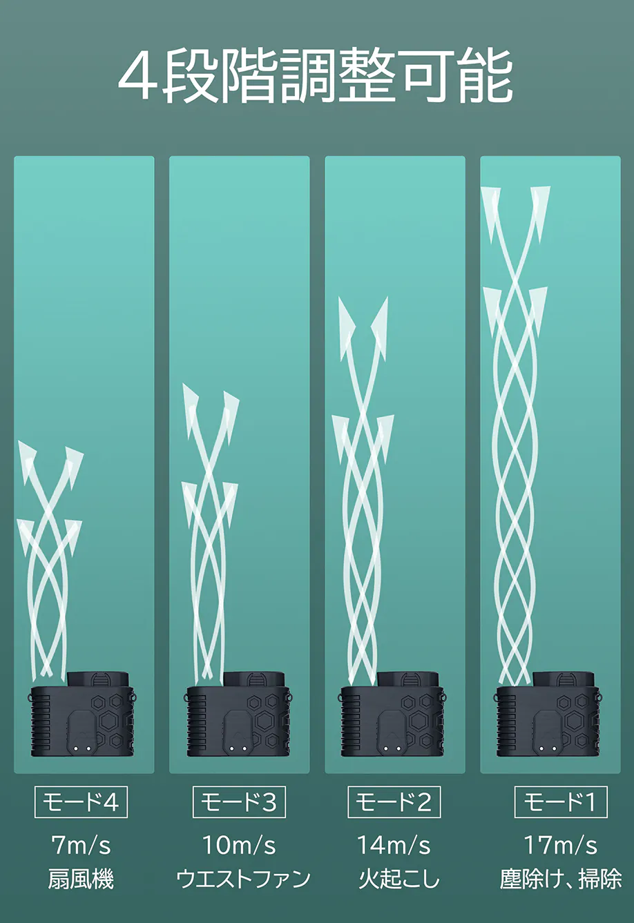 風量は4段階調整可能で、一番弱いモード4でも秒速7mの強風になり、扇風機として使用するのに十分です。モード1~3はより強力な噴射が必要な場合で対応できます。