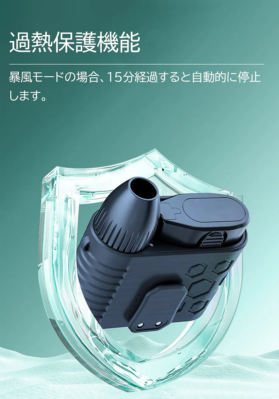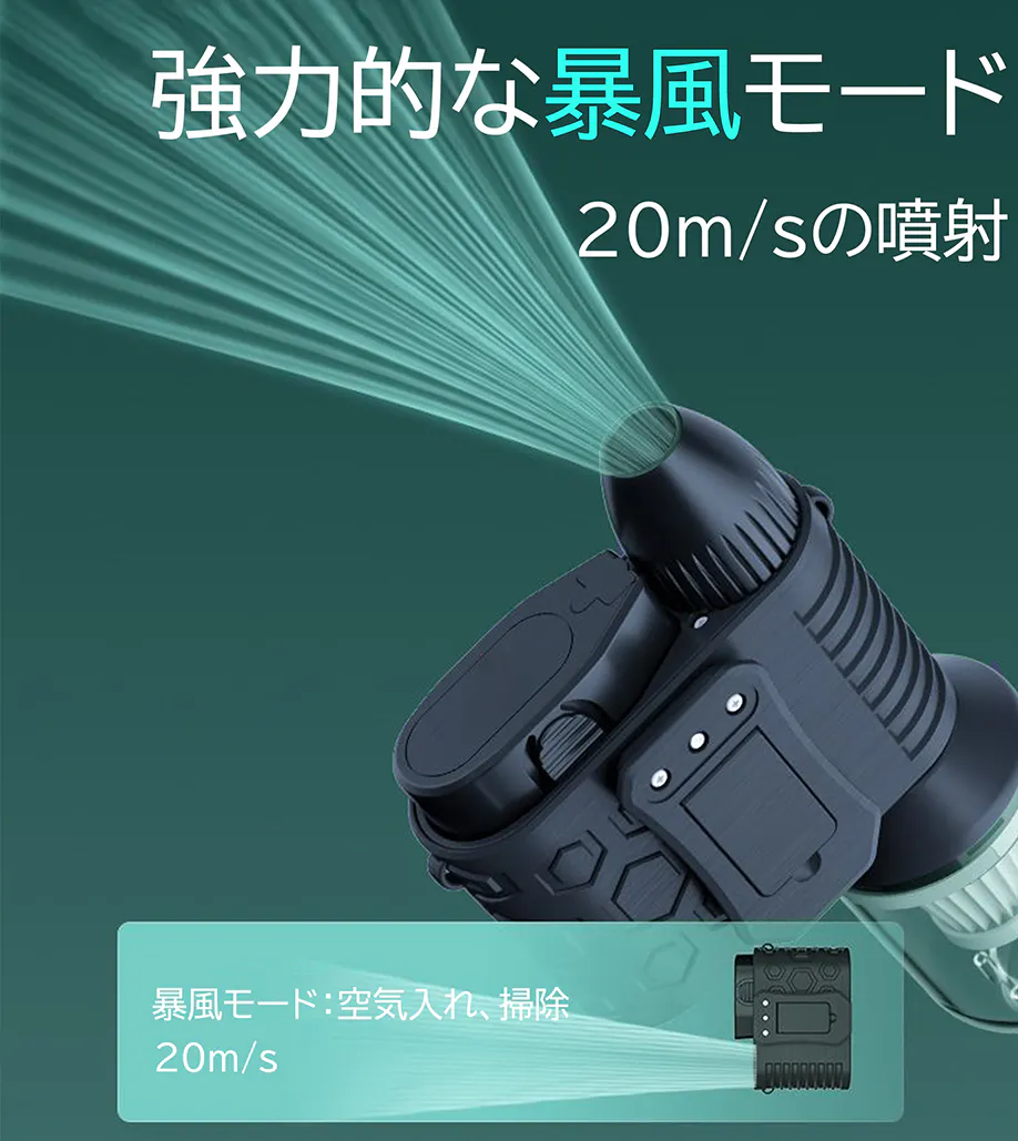 モード1~4以外に、より強力的な暴風モードがあり、モータの性能を発揮して秒速20mの噴射ができます。