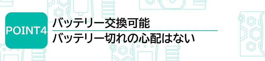 また、バッテリーが交換可能で、利用時間が「無限」になります。