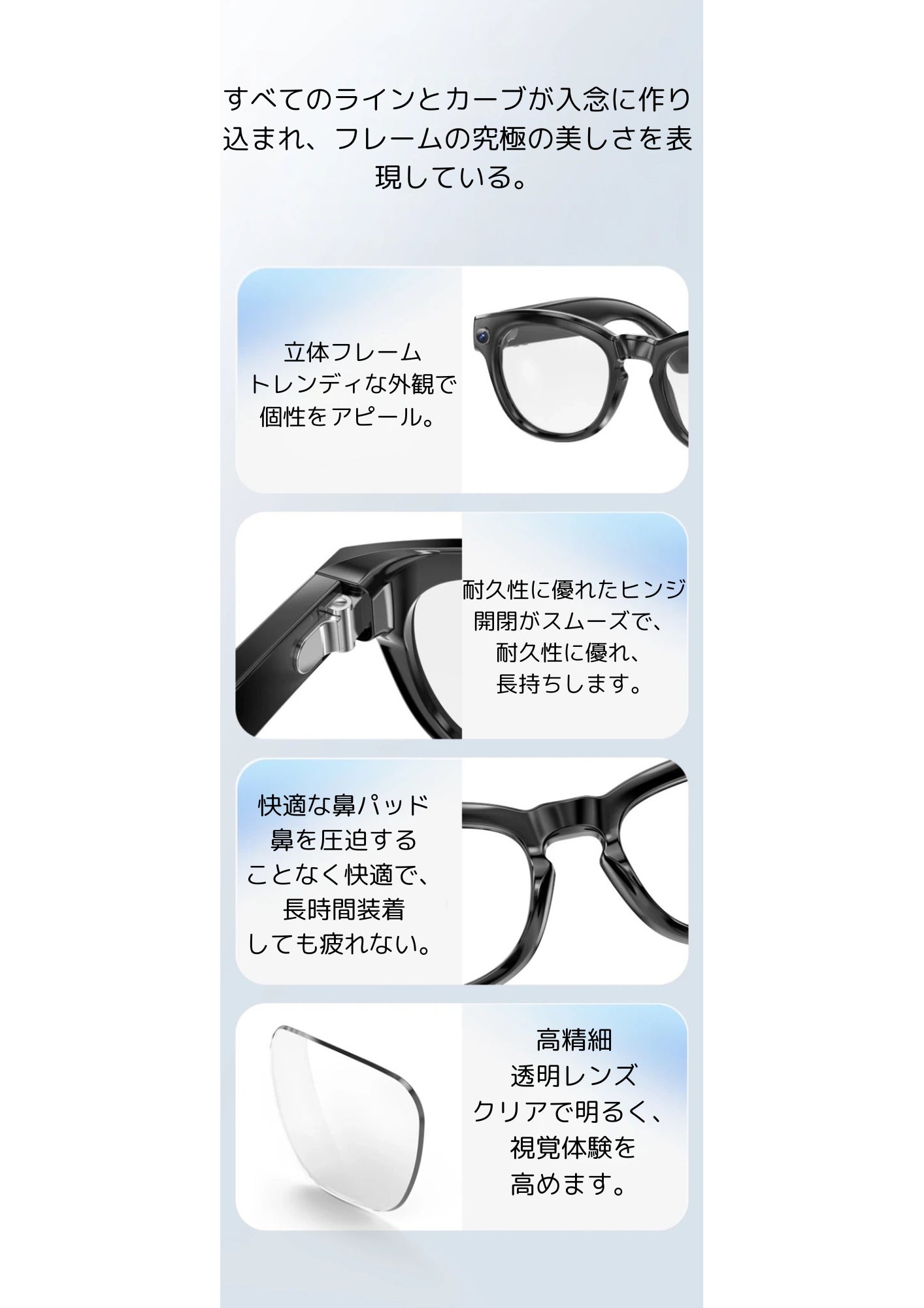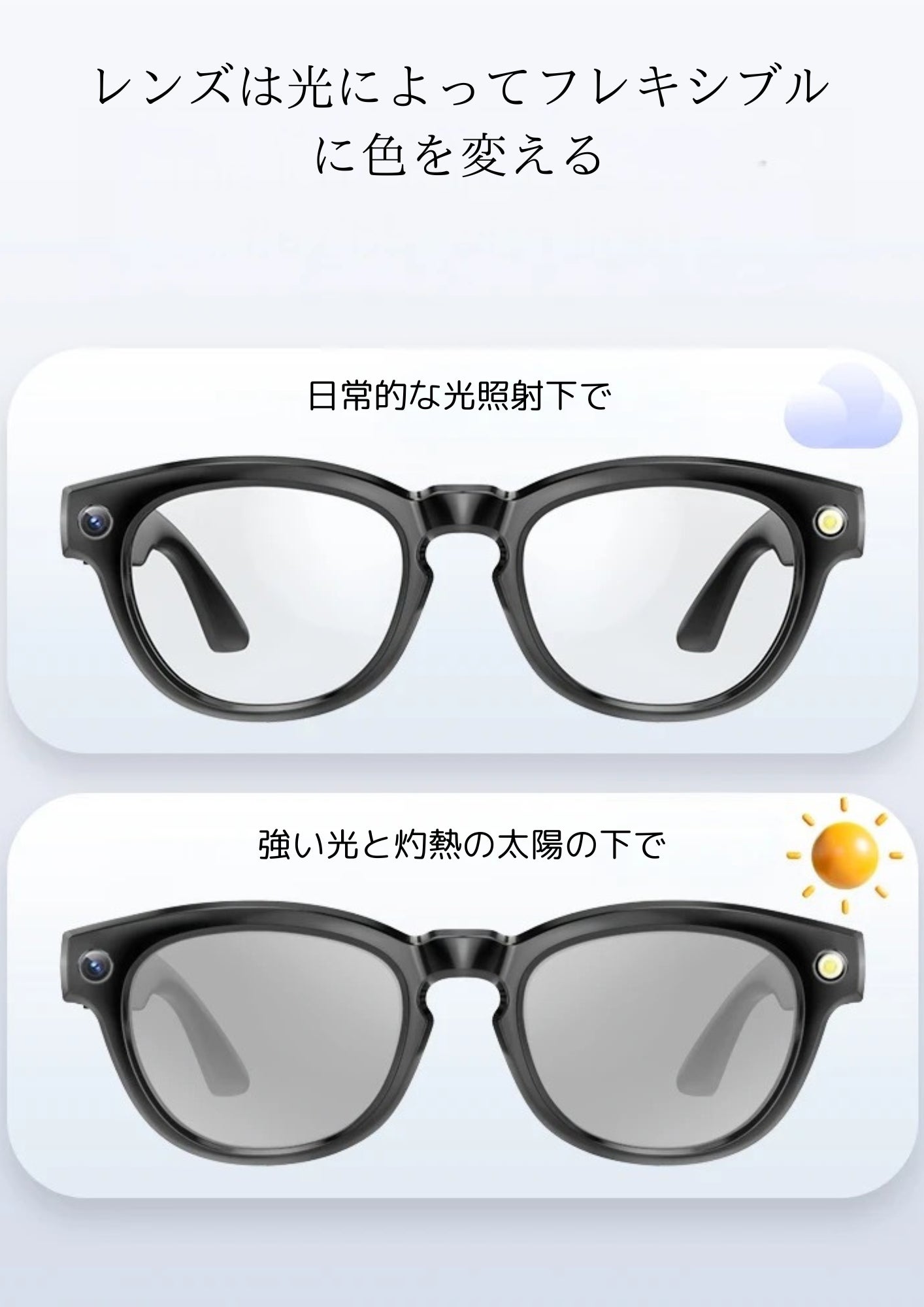 このスマートグラスは、最新技術とスタイリッシュなデザインを兼ね備えた理想的なガジェットです。日常生活をより豊かにするための必需品となるでしょう。