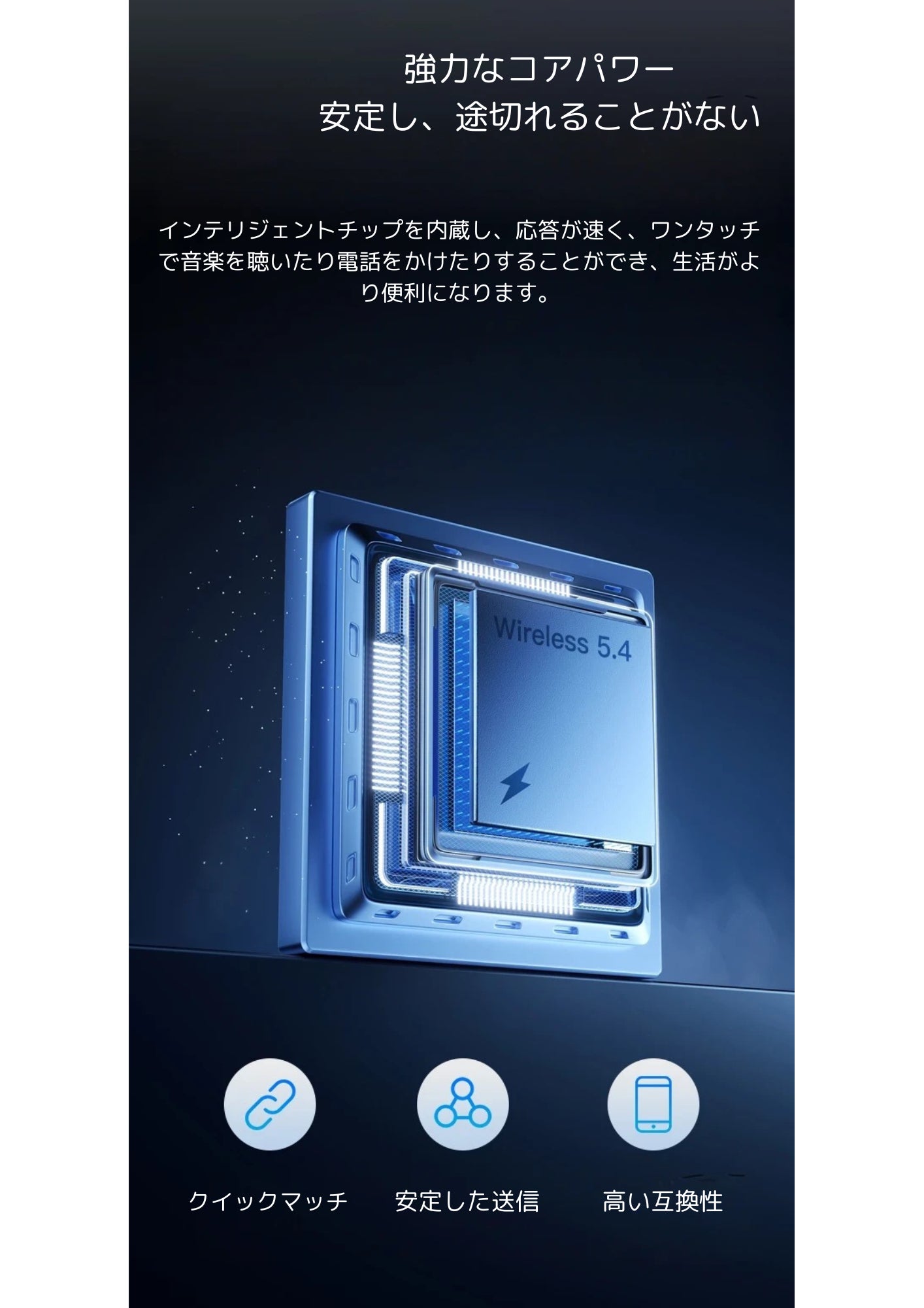 ダイナミックドライブ&サウンドキャビティ設計: 独自の音響設計で、聴覚障害を避けつつクリアなサウンドを楽しめます。インイヤーデザイン: 周囲の音を聞きながら、音楽を楽しみ、安全を確保できます。オープンソリューション: 音楽や通話に対応しながら、メガネからの通知も受け取れます。