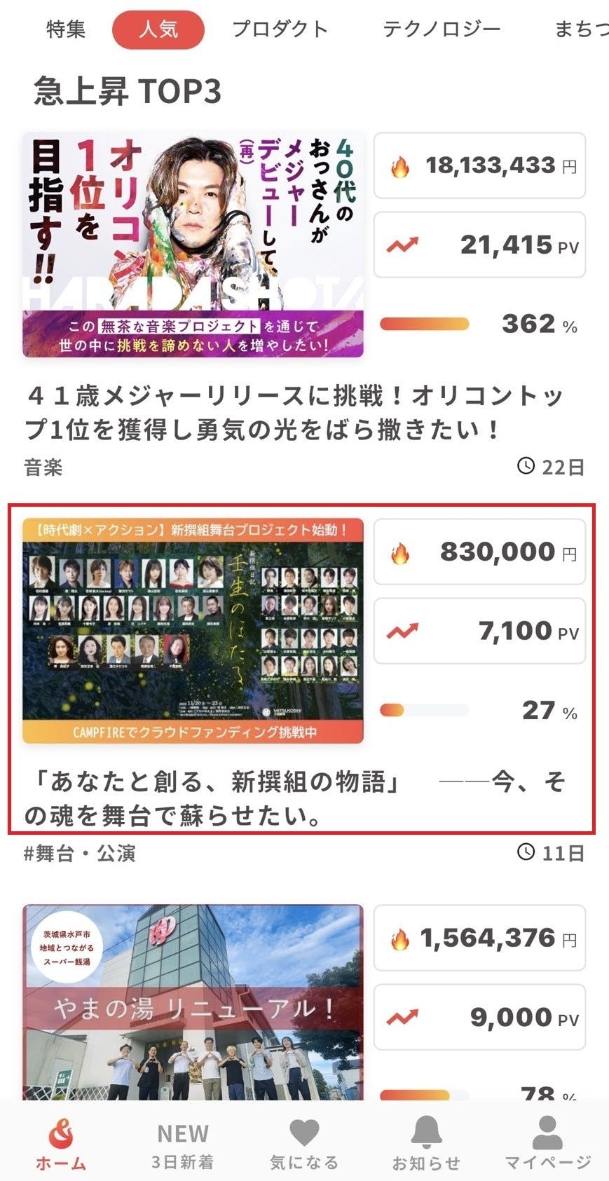 急激に支援の輪が広がりまして、一時、CAMPFIREの急上昇ランキングでTOP3に入っておりました!〈88888888888888888〉←あ、これ、「8」=「パチ」で拍手の意味です(笑)