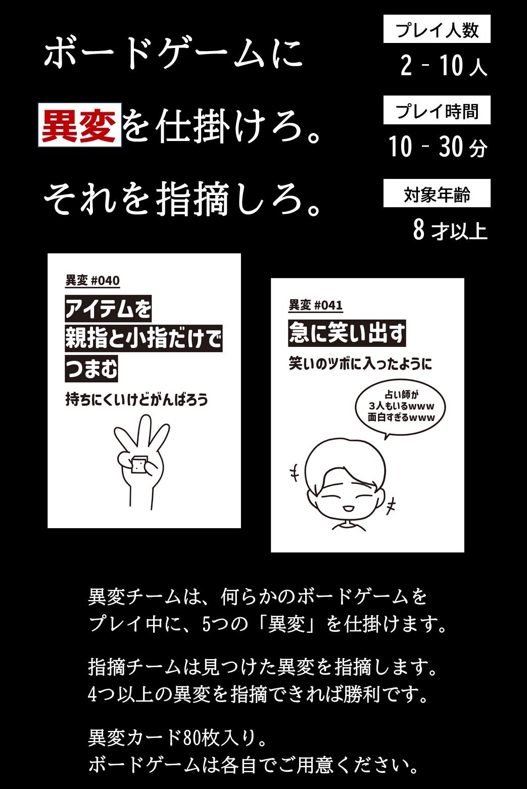 異変ボドゲは、何かしらのボードゲームを遊びながら、異変を仕掛け合うゲームです。ゲームマーケット2025春にて販売したのですが、大変ありがたいことに開始3時間で50部すべてが売り切れてしまいました。再販を希望される声も多数いただいており、いち早く皆様にお届けしたく、クラウドファンディングという形を取らせていただきます。