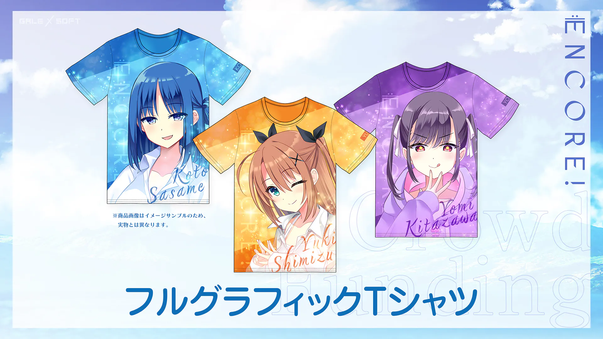 由綺、よみ、琴途3人のいずれかのキャラクターのデザインのフルグラフィックTシャツです。