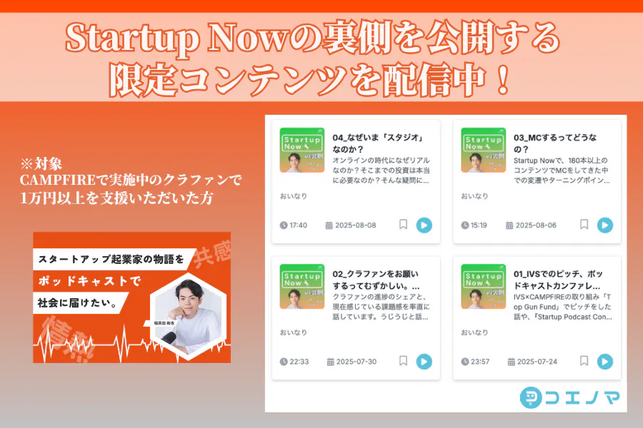 そこで、1万円以上支援いただいたを対象に【限定配信コンテンツ】をお渡ししております。外では言えない、Startup Now運営のリアルな心境、どんな工夫を凝らしているのか、今後はどう成長していこうとしているのか等を、音声の限定配信ツール「コエノマ」を通じて届けてみようと考えています。