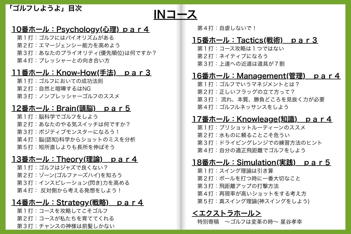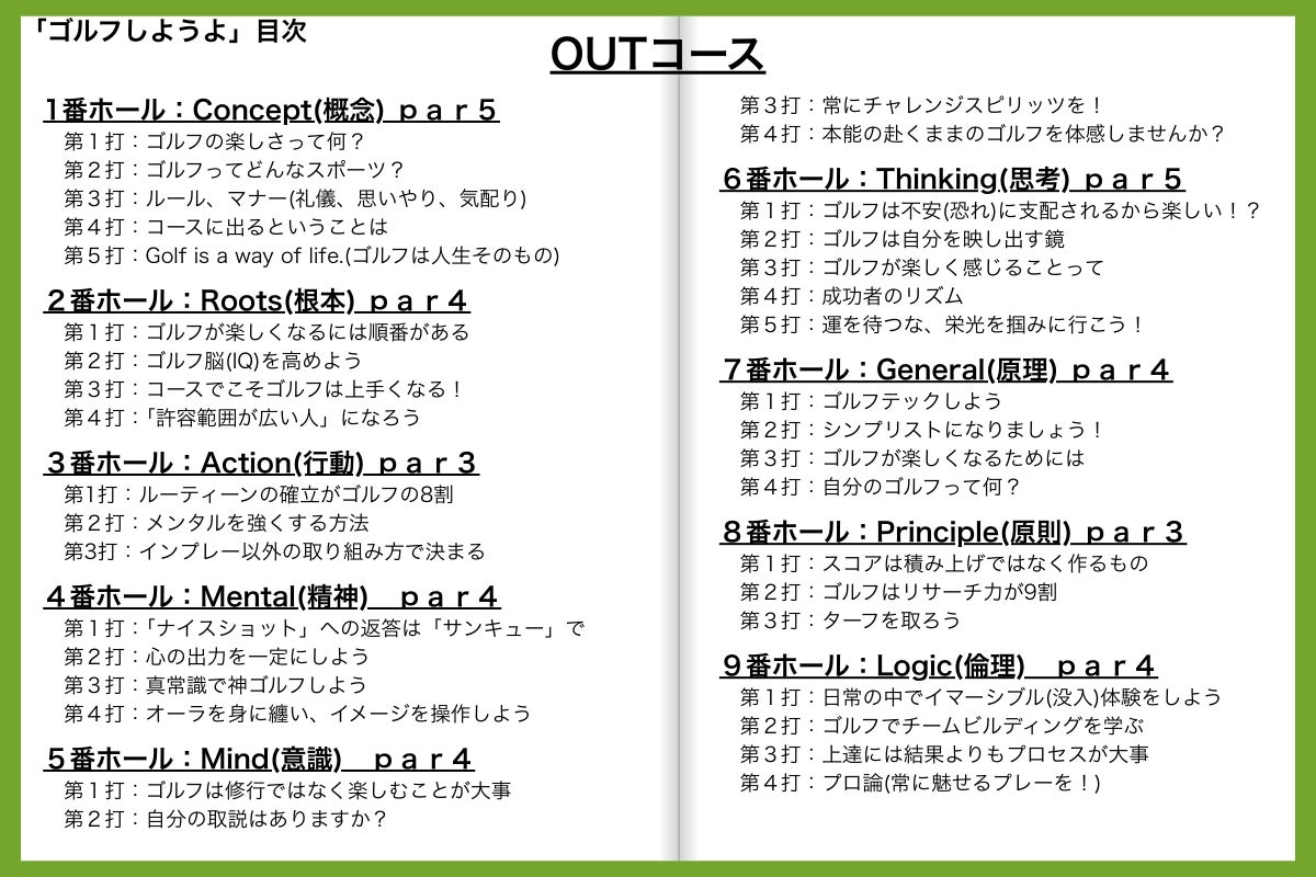 内容は、私個人の経験だけではなく、ラウンドレッスンや企業研修を通じて出会った方々の実話・気づき・感動を数多く盛り込んでいます。