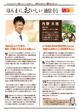こんにちは。 内野家のセントラルキッチンでマネージャーを務めております。 内野大地です。(上の画像は五年目の自分がインタビューされた時の記事です。) 内野家で勤めて六年目になります。 この五年間の間に、自分も含め、スタッフみんなが試行錯誤する姿をたくさん、見てきました。 その都度出来上がる商品の中でお客様のお声を多く頂き、その中でも一番多く 言ってもらえた言葉が「内野家さんのお惣菜は優しい家庭の味がするね」でした。 そんなお客様の声が、今回uchipacを通して、 全国の皆様から聞けるとなると、本当にうれしく思います。 常温で保存できる、素材の味を生かした製法というuchipacの強みで 老若男女問わず色んな方に食べてほしいです。 uchipacが始まってまだ数か月です。 これからもっと種類を増やして 選んで楽しい!食べて美味しい!uchipacを造っていきます。 皆さんと一緒にuchipacを成長させていきたいです。 これからのuchipacをよろしくお願いします。