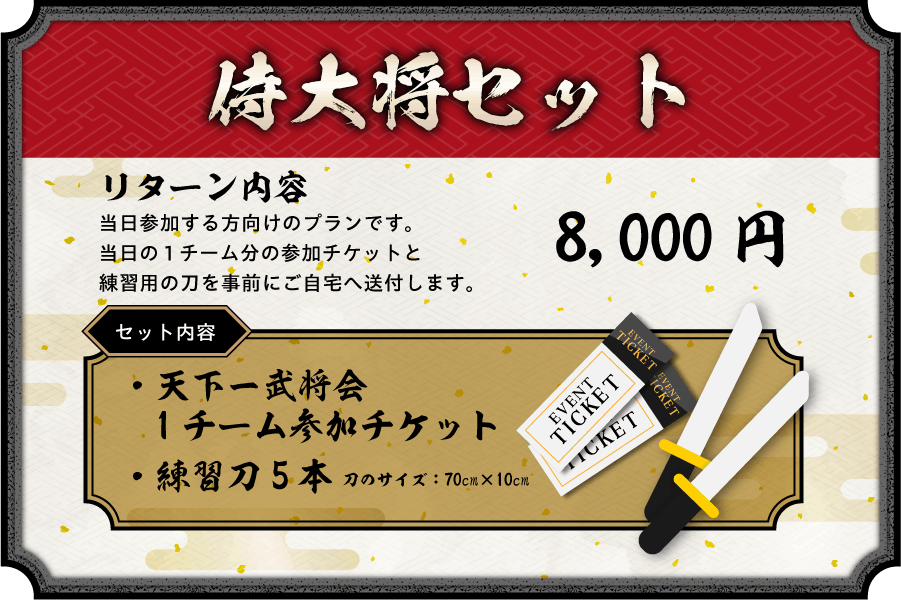 こちらは天下一武将会に参加できるだけではなく、特別に非売品の刀を事前にお送りさせていただく現代でいう、チート課金セットとなっております。