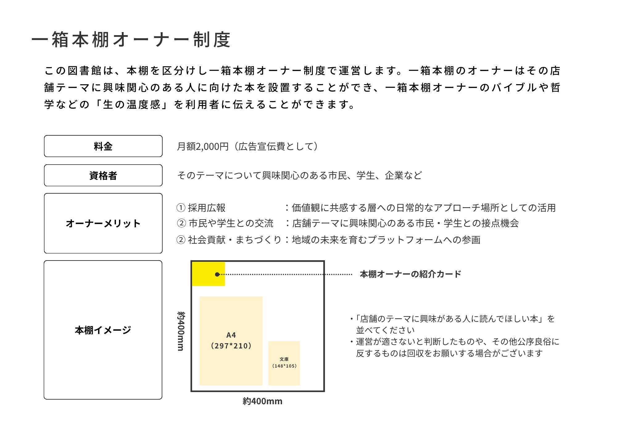 ・設置する図書は、本棚オーナーが選ぶ「店舗テーマに興味がある人に読んでほしいおすすめの本」