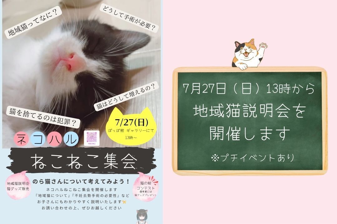 『さくら耳』猫が好きな人、地域猫や野良猫に興味がある人で常識レベルで知っているであろう『さくら耳』ですが、私たちの地域ではこの『さくら耳』を知らない方が多くおられます。さくら耳の猫を見て、『この猫は耳を怪我している』と言われる方がいらっしゃったり、そもそも地域猫と保護猫の違いがなんなのかわからない方がいらっしゃったり、まだまだ地域猫の考え方や不妊去勢の必要性が地域に浸透しているかと言えば、程遠い段階です。そこで気軽に猫について知ってもらうきっかけづくりとして、『ねこねこ集会』を開催することにしました。この集会は、地域猫のことや猫の不妊去勢手術がなぜ必要なのか、どうしてこんなに問題視されているのかを、一緒に考えていける場にしたいと考えています。また、野良猫問題は放置すればするほど大きな問題に発展する場合が多いです。『誰にも相談できない』『どこに相談したらいいのかわからない』『いつかどうにかしようと思っている』そう思われる方にこそ、ぜひ足を運んでいただけたらと思います。今週末から夏休みにも入りますので、自由研究の課題とするのもよし、暇だし行ってみようー!でもよし、お子さんにもわかりやすく楽しめる時間を提供できるよう頑張ります!当日は、説明会のほかプチイベントや猫雑貨の販売も予定していますので、ぜひ遊びにきてください。私も色々勉強しながら、勉強させてもらいながら今回のねこねこ集会を開催します。野良猫に困ってる方がたくさんいる私たちの地域だからこそ、どうしたら猫も人もハッピーになれるのか一緒に考えてみましょう。お待ちしております!NPO法人ネコハル 和泉嘉奈