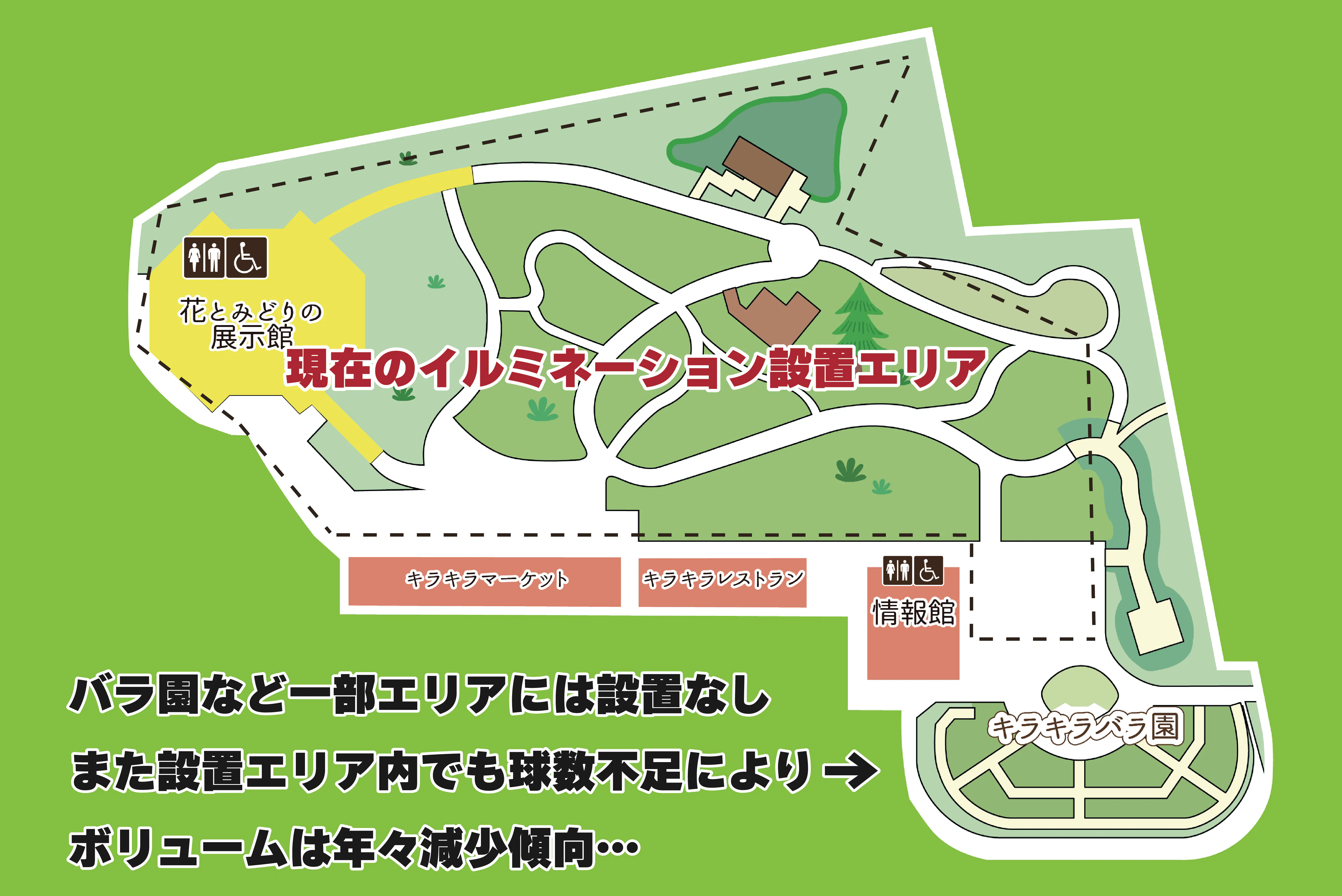 しかし、見頃となる花の少ない夏場や冬場の時期を彩るために10年前から始めたイルミネーションが、経年劣化等を理由に、当初の20万球から13.5万球へと減少してしまいました。