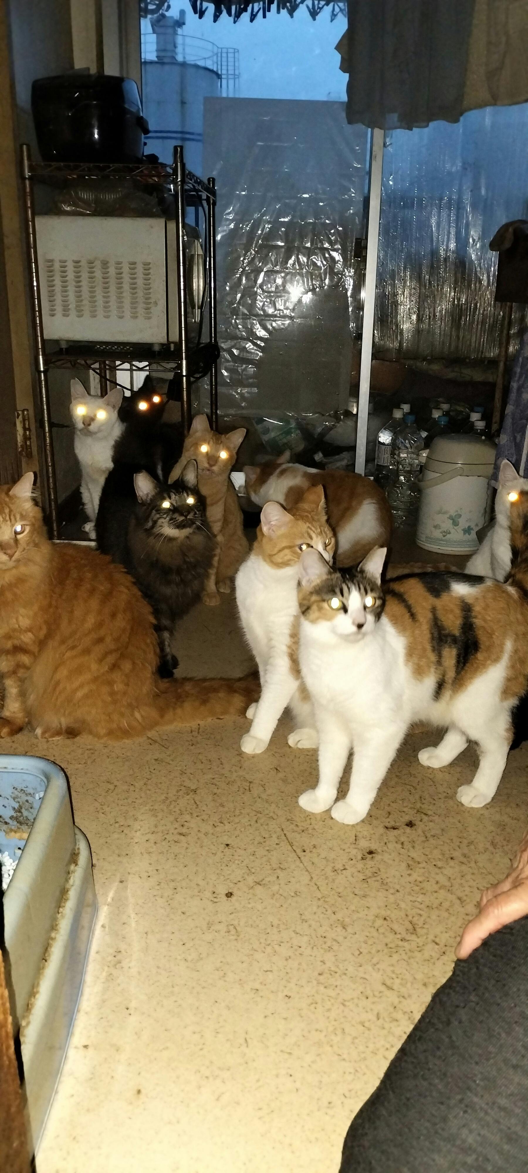 工業団地の市営住宅で高齢者の方々の餌やりによって増えてしまった野良猫達です、避妊、去勢をしました。毎晩餌やりに通っています。今は地域猫として市営住宅の高齢の方々と一緒にみまもっています。