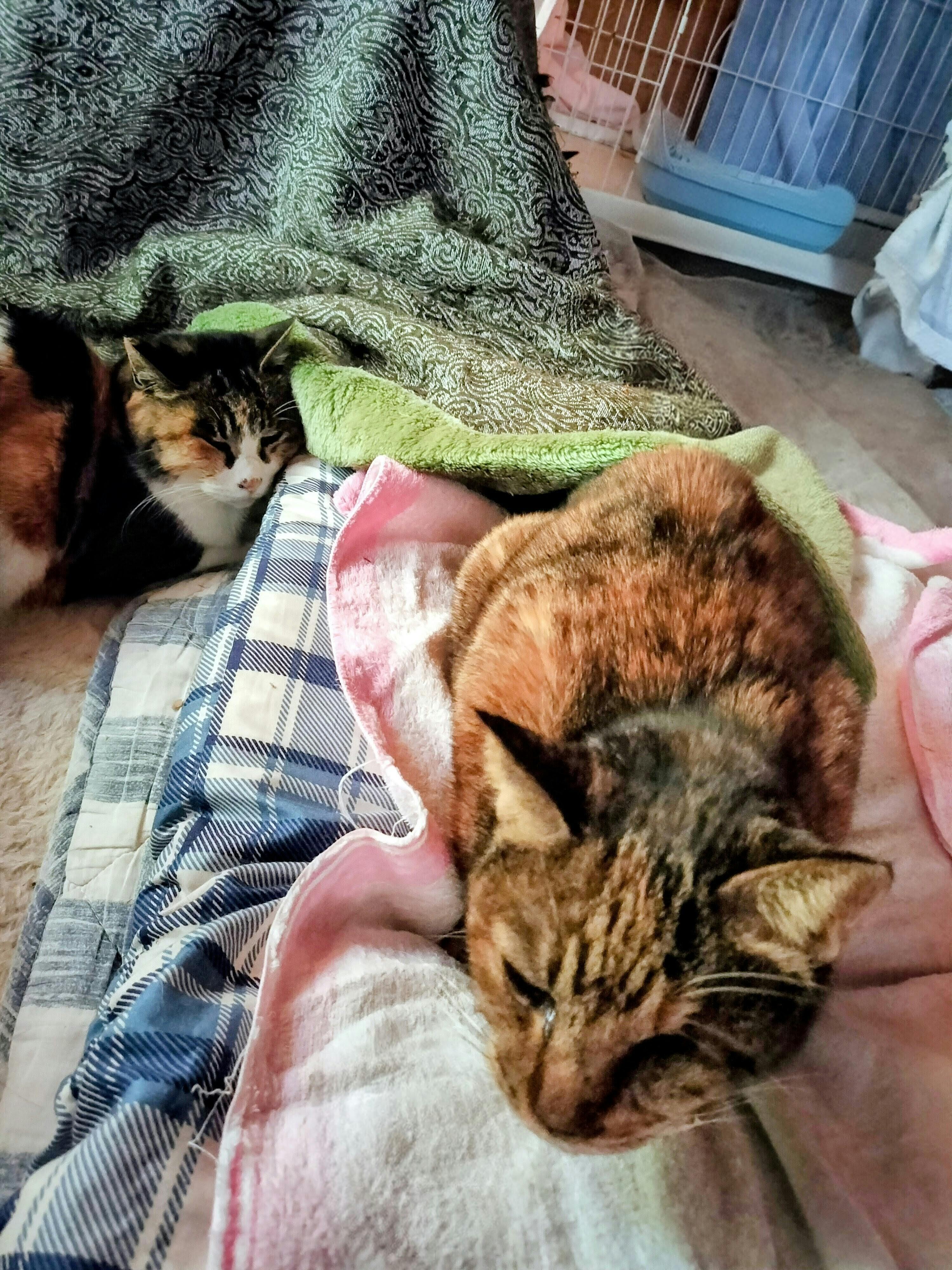2026/01/04 10:03昨日は本当にびっくりしました…小ミケちゃんはいつも絶対に茶の間に来ないのですが、昨日は布団の上で一緒に寝てくれました。チャッピーも一緒でした。 チャッピーは毎日点滴していますが、やっぱりスープしか飲んでくれません… おまけにミミちゃんの風邪まで移されました… 体力がないので、すぐに病気をもらってしまうのです。お布団の中で寝てくれました。ネズミのオモチャも4つ買ってきましたら、少し遊んでいました。今日は薬を全部吐いてしまいました…本当にガリガリとなって来てしまっていますので、元気な顔をいつまでも見れるのか、凄く悲しくなります。寒いお外でずっと一人ぽっちで待ってくれているすみれちゃん、みきが全然一緒に居てくれなくなりました。 一昨日はみきもすみれと合流したのですが、なぜだか、すみれがみきを受け付けませんでした…ご飯を食べないで、逃げて行きました。 ずっと見放されているから、怒ったのかな〜と思いました。 本当に兄妹なのに、別々にいるのはとても寂しくなります。 何処で寝ているのかも心配です。 毛布もカイロも置けないのが、毎年の悩みです。家の近くの猫達は水入れも置けなくなりました、小屋も片付けられました。なので、作った小屋を回収しまして、お向かいの方の猫達が寝ている壁際に毛布とカイロを入れてきています。 六匹分は寝れない狭い所ですが、毎晩凄く冷えるので、本当に可哀想です。母猫は何処かで寝ているようです。 みんなが私を見つめていますが、小屋をなぜ片付けたの?と問いかけられている様です。 なので、ごめんね、もうここには置けないんだよ…と謝るしかありません。母猫とマーブルちゃんです。寒いよ〜と訴えてます。上の茶トラ君は白い足の悪い子猫の兄妹です、なんだか、いつもこんな顔で見つめてきます。やっと風邪も治りましたが、あまり食欲が無いんです…お向かいの方からご飯でももらっているのかなぁ〜と思ってしまいます。お水もお向かいの方の家の植木鉢の横に置きました。 書き置きしましたが、返事が来ないので、仕方なくて、植木鉢の横に置きました。万が一撤去されたら、お向かいの方のお隣の方にお願いをしようと思っています。2週間前にお隣の女の方とお話をしました。以前野良猫達にご飯をあげていたそうです。でも、網戸をボロボロにされたので、やめたそうです。 私が餌やりしているのを見ていたので、あげてくれているんだなぁ〜良かったと思ったそうです。 そんなに悪い方々は居ないようでした。ほっとしました。チャッピーの為にトイレをケージに入れたのですが、なぜだか小ミケちゃんが寝てました… 姿か見えないと思ったら、くっさい~トイレの中でした…本当にプロジェクトが成功しまして、支援者様方に心から感謝を申しあげます。 本当に沢山の温かいご支援をありがとうございました。支援金は1月の16日の振込になりました。予定では、387.000円の予定です。まだ確定していませんが、前回も手数料が加算されましたので、確定しましたら、活動報告にて、ご報告をしたいと思います。入金されるまで、大変申し訳ありませんが、アマゾンの欲しい物リストでの支援物資を少しでもよろしくお願い致します。チャッピーはこれしか食べてくれません、あっと言う間に無くなってしまいます、 どうか、チャッピーの為によろしくお願い致します。 もっと見る
