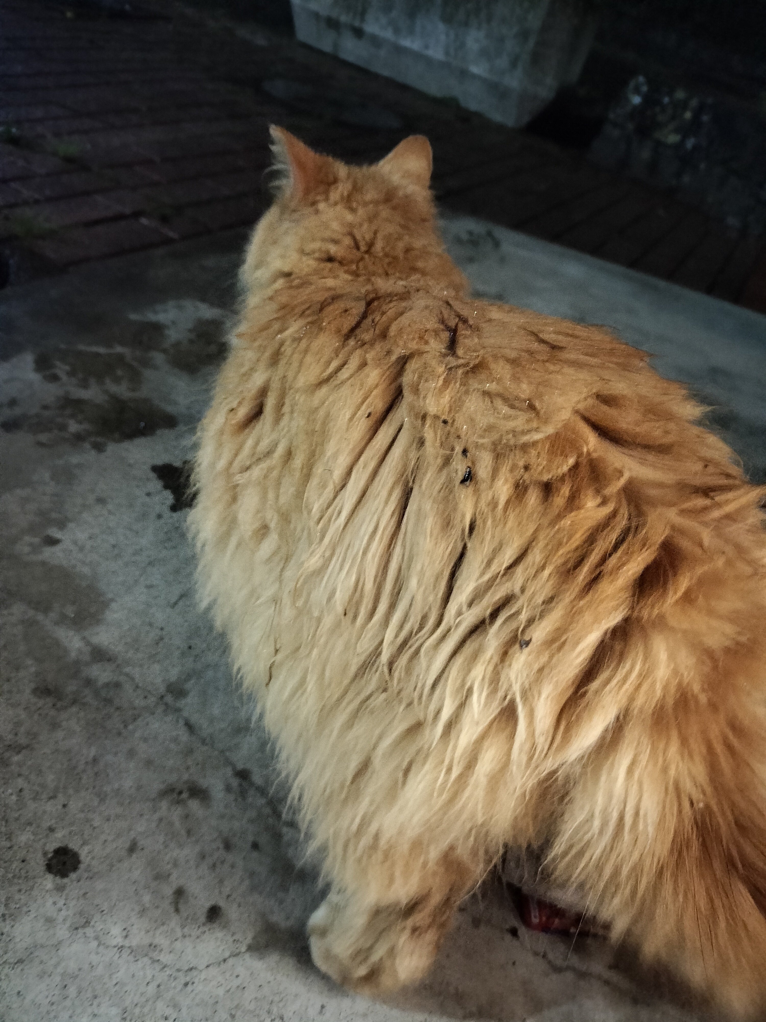 そろそろ梅雨にはいるのでしょうか、昨晩から降り続いていた雨のお陰で、ご飯を待っている猫達もびしょ濡れでした〜 長毛の女の子もびしょ濡れです。体中にあっちこっちの葉っぱとゴミを付けて、出て来ました。取ってあげると嫌がって叫びながら逃げていきます。いつもの可愛さがまったくなくなっていました(*_*)
