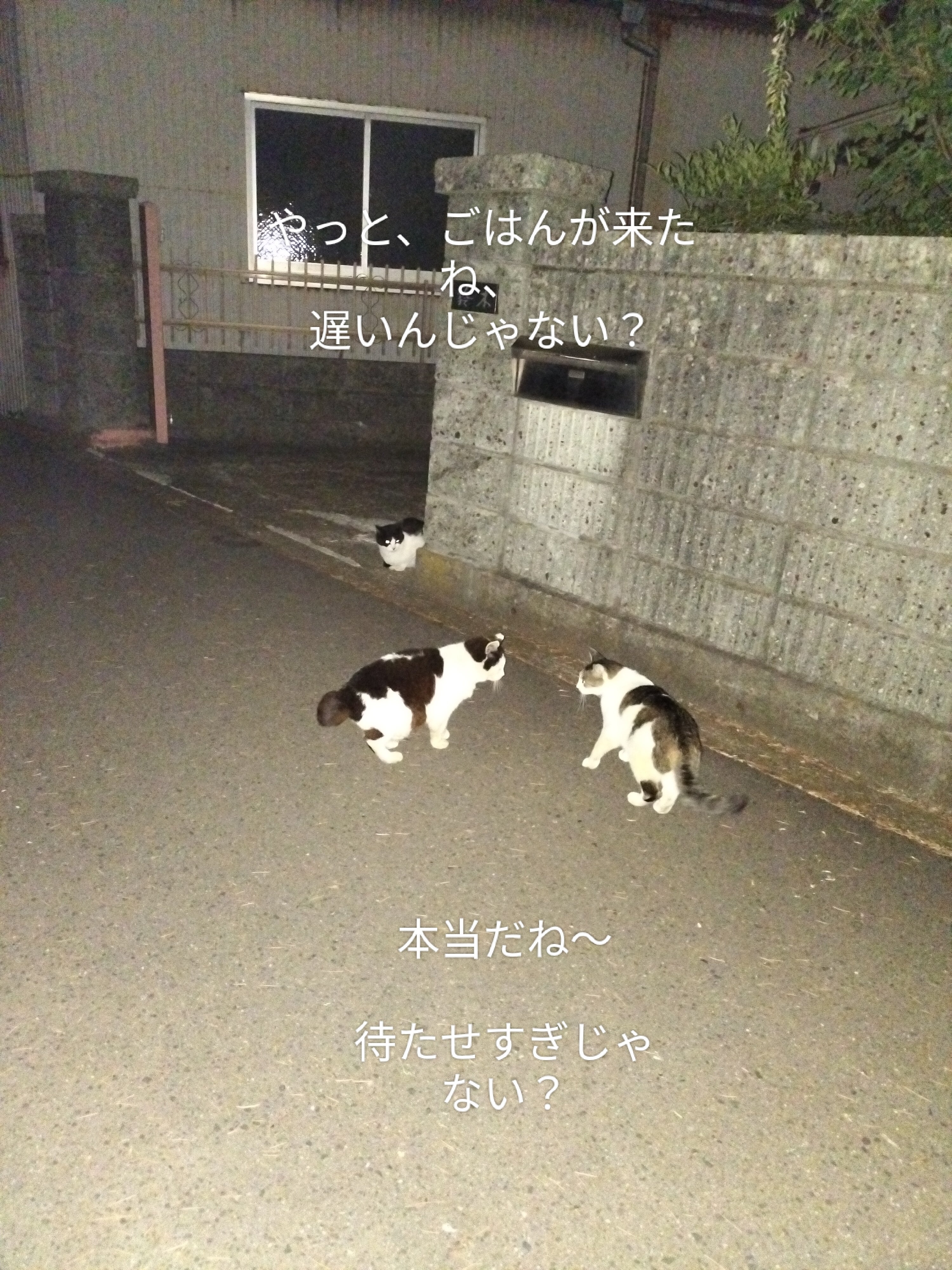 上の写真の子達(お婆ちゃん猫、母猫、子猫3匹)は一昨年の冬に猫小屋をこちらのお宅のおじいちゃんに作ってくれました。今も住まわせていただいてます。本当にありがたいことです。でも、おじいちゃんは仕事をしていないので、少ない年金暮らしですが、それでも、5匹の猫家族にごはんをあげてくれてます。量は少しですが、それでも、おじいちゃんに感謝でいっぱいです。夜は私を待っています。遅くなるとこんな会話をしているんたろうなぁ〜と勝手に思っています。