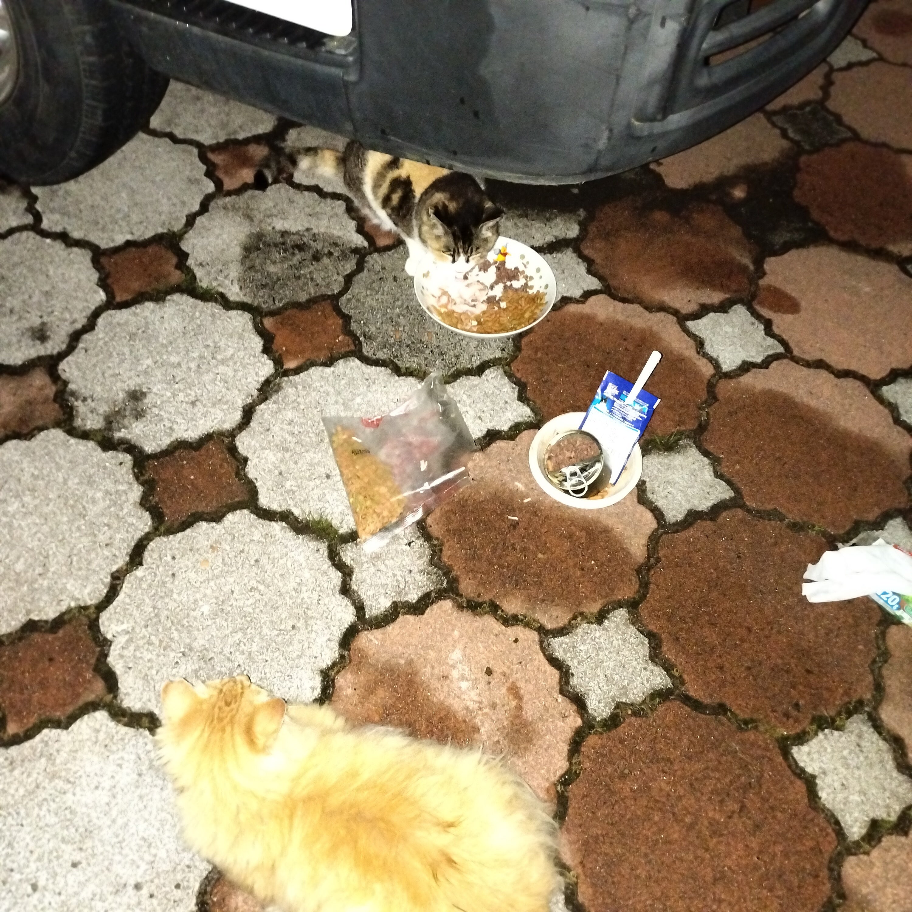 ミケちゃんをシンディーがいじめたりするのです、生意気に! なので、シンディーに見つめられると、ミケはうなって食べるのをためらっているのです… シンディーを向こう側に追いやるのですが、又戻ってきます…ミケちゃんの方が昔からこの公園で暮らしているのに、今ではその暮らしを脅かされていますಠ_ಠ