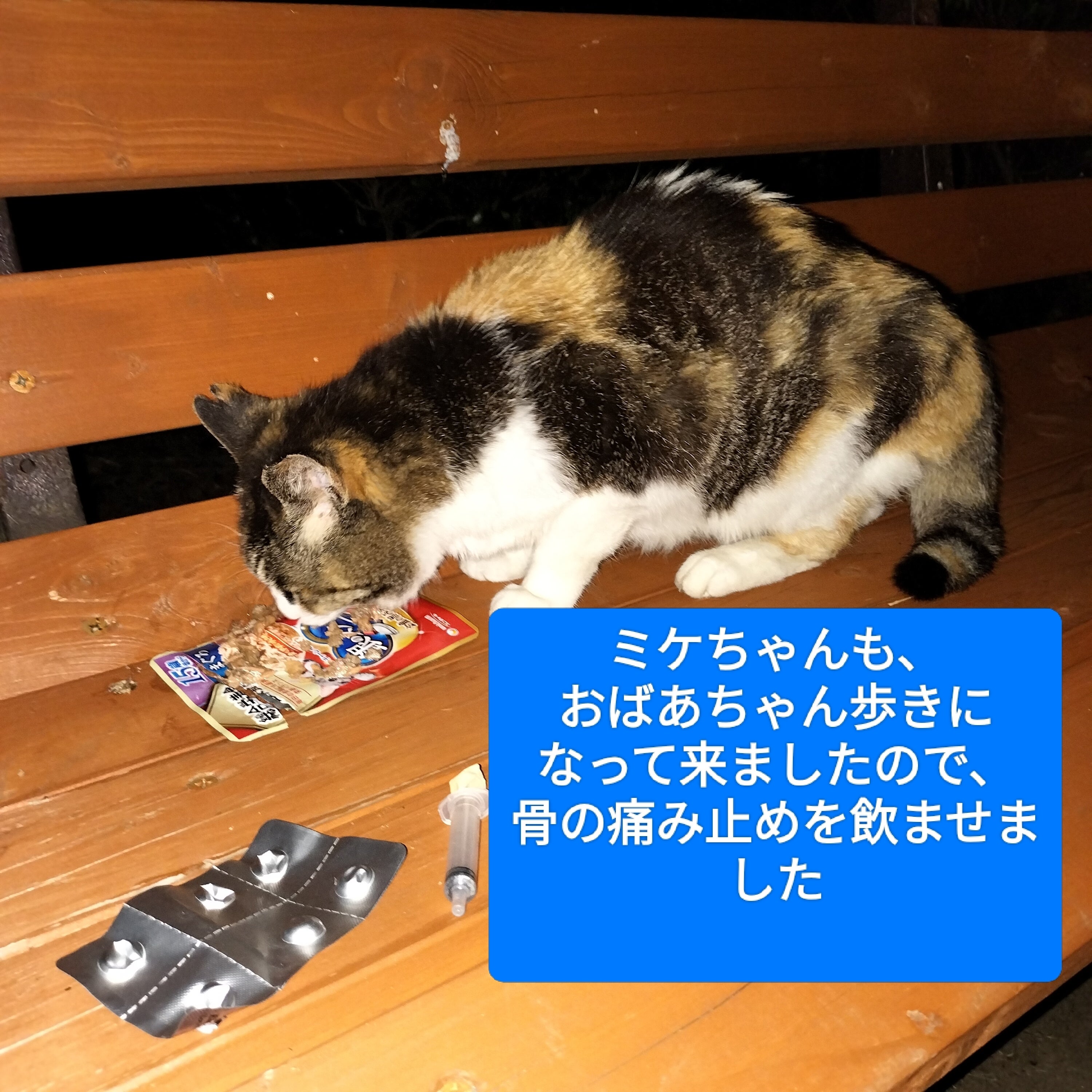 猫達も年を取ると色んな病気になってしまいます。ミケちゃんもベンチでひと休みしてました。