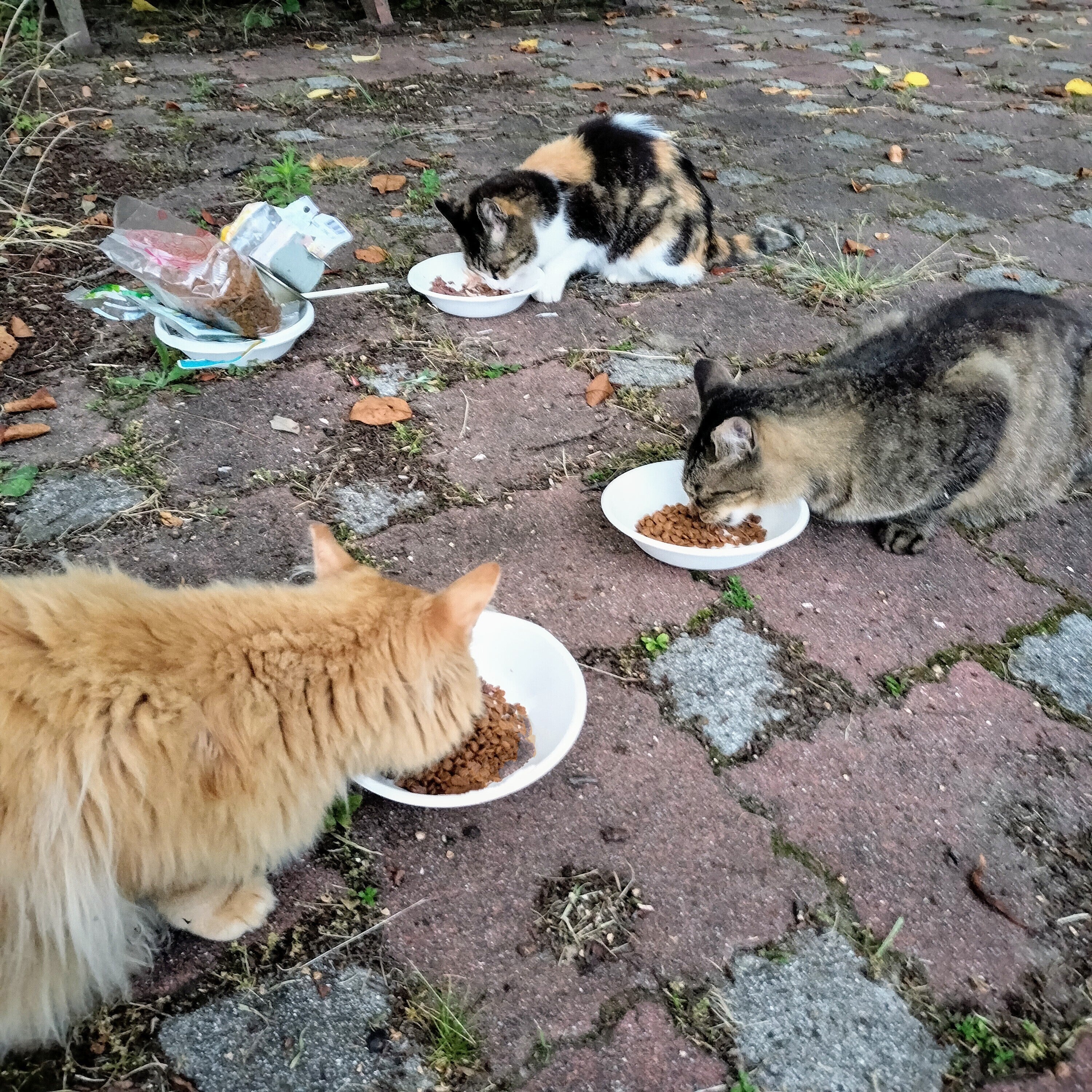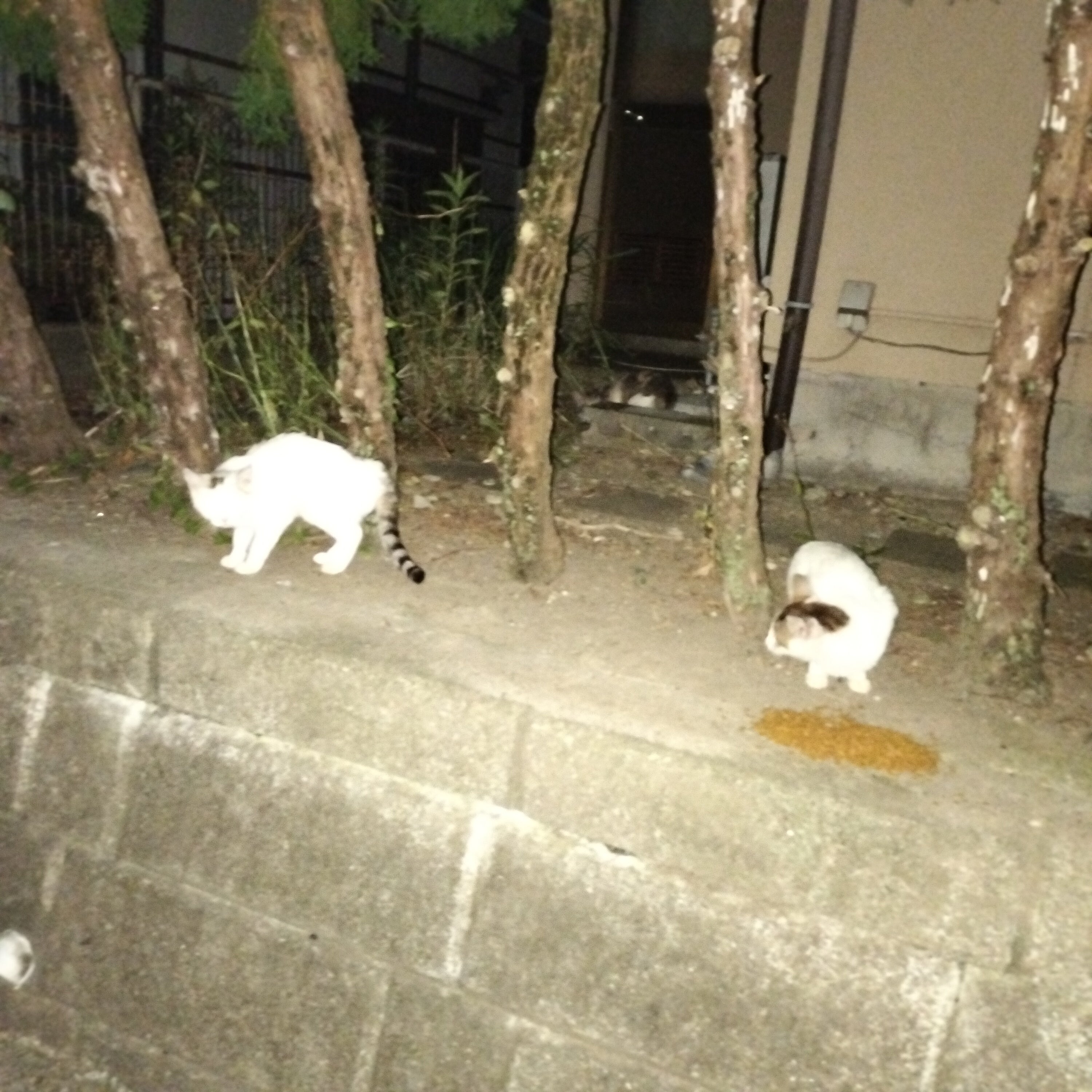 家の近くの猫達の事が心配でしたので、仕事帰りにご飯を置きにいきました。やっぱりずっとご飯を待っている子がいました。場所が団地の中ですので、夜な夜なに車を停めて餌やりをするのも気を使います。不審者と思われたら大変なので、どろぼうの様にそそくさと餌を置いてきました…そうしましたら、向かいの家から別の猫達がご飯だと分かり、飛んできました。本当はお皿に入れてあげたいのですが、長い時間居られないので、直に置くしかありませんでした。又、どろぼうの様に逃げていきました。 少しでもお腹の足しになれたら良いと思いますが。