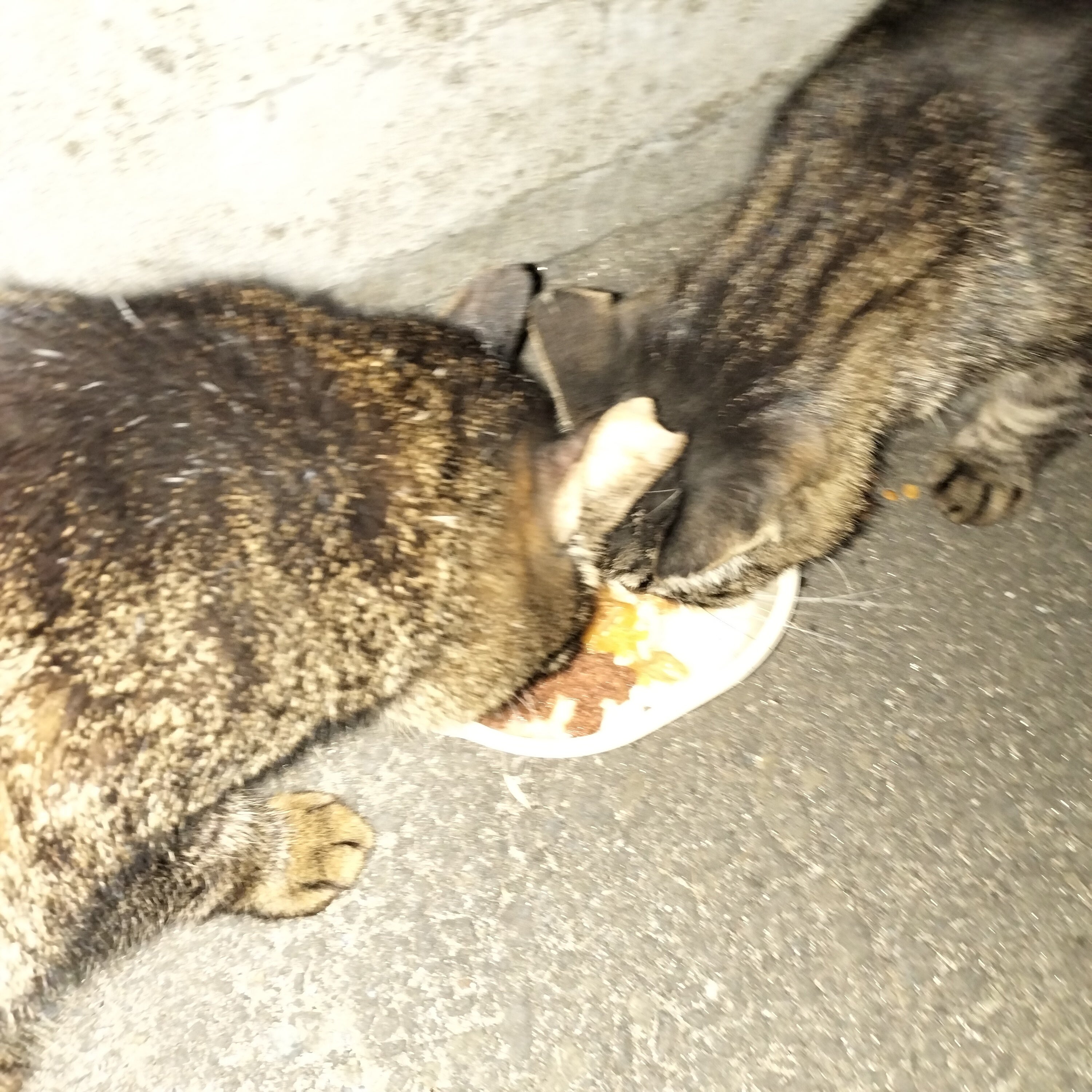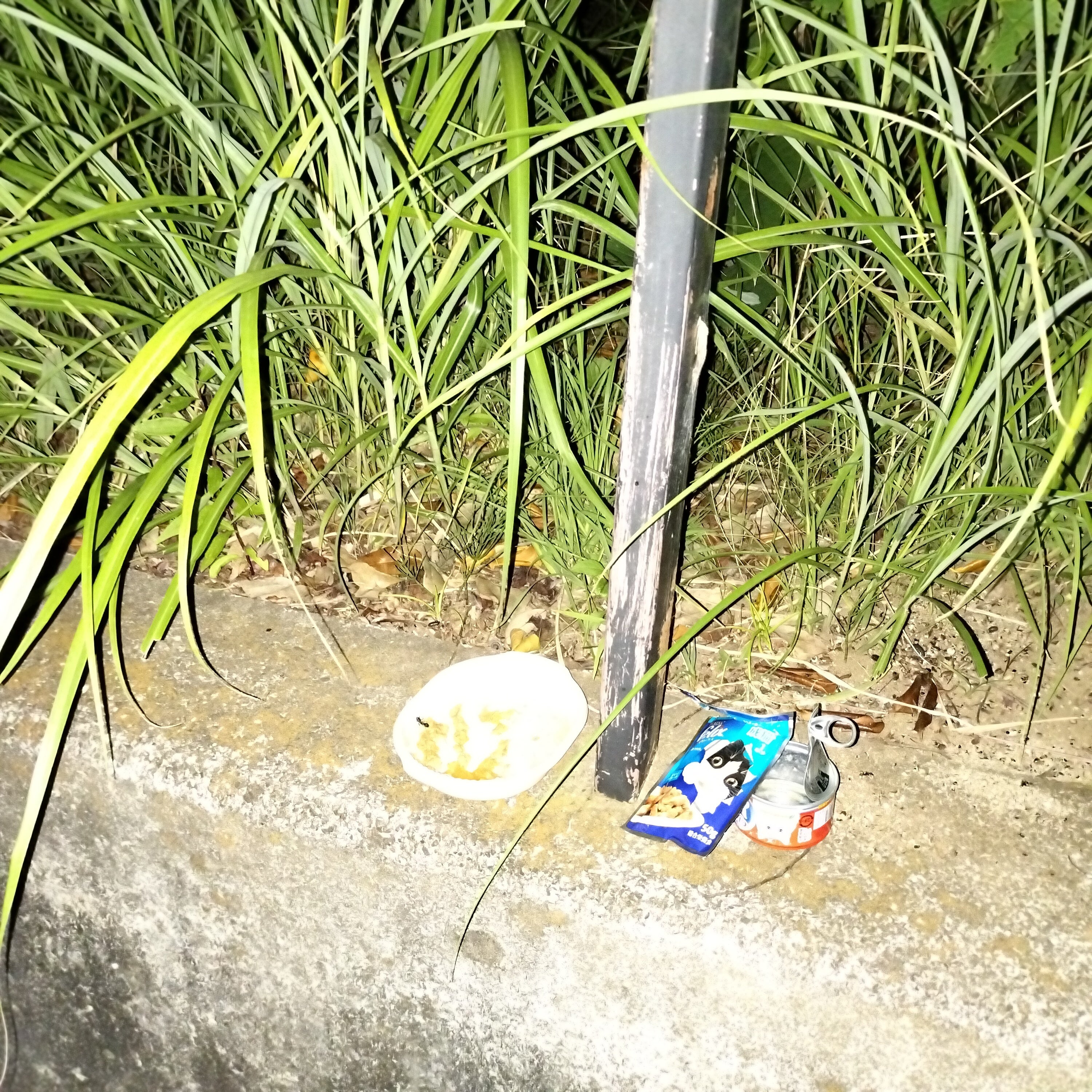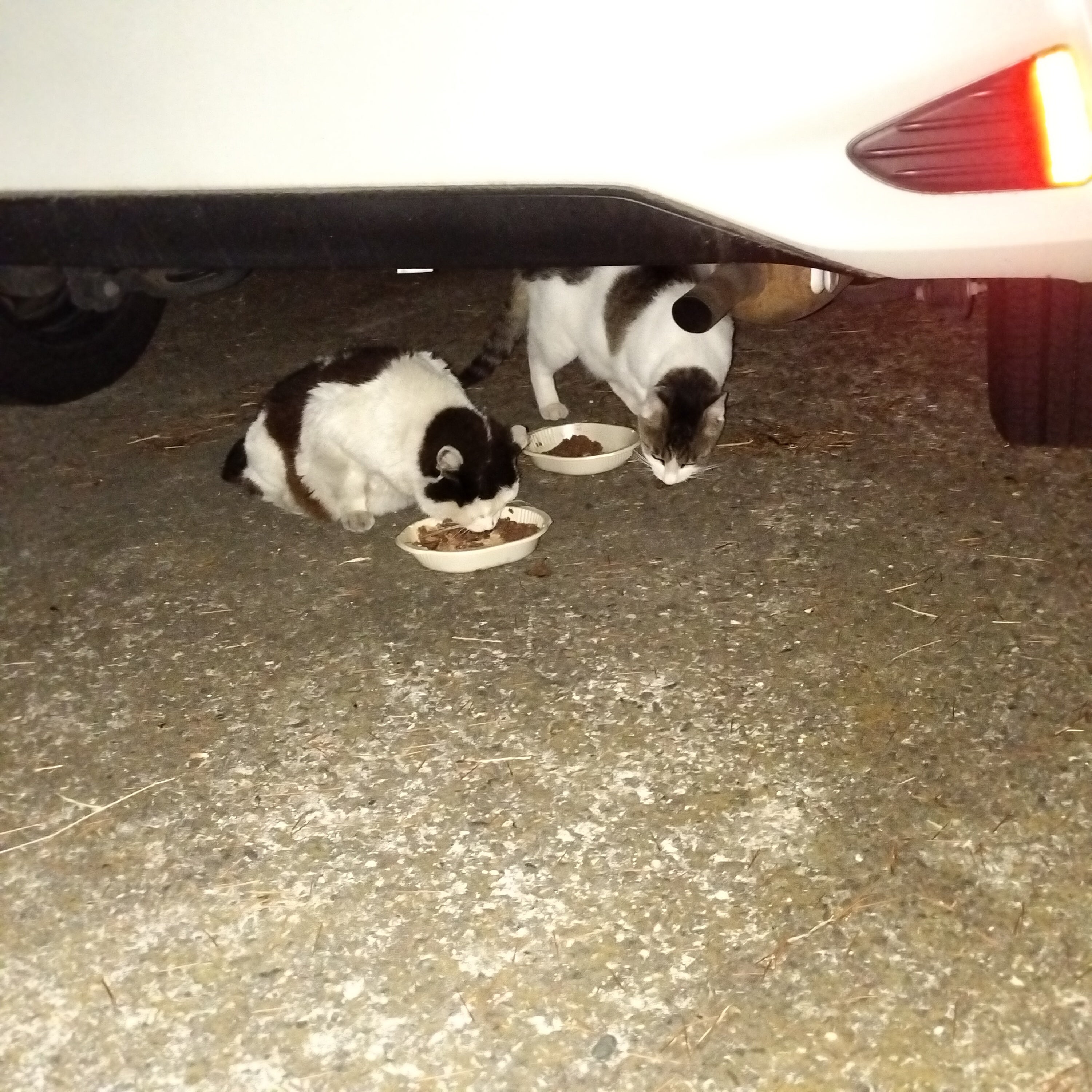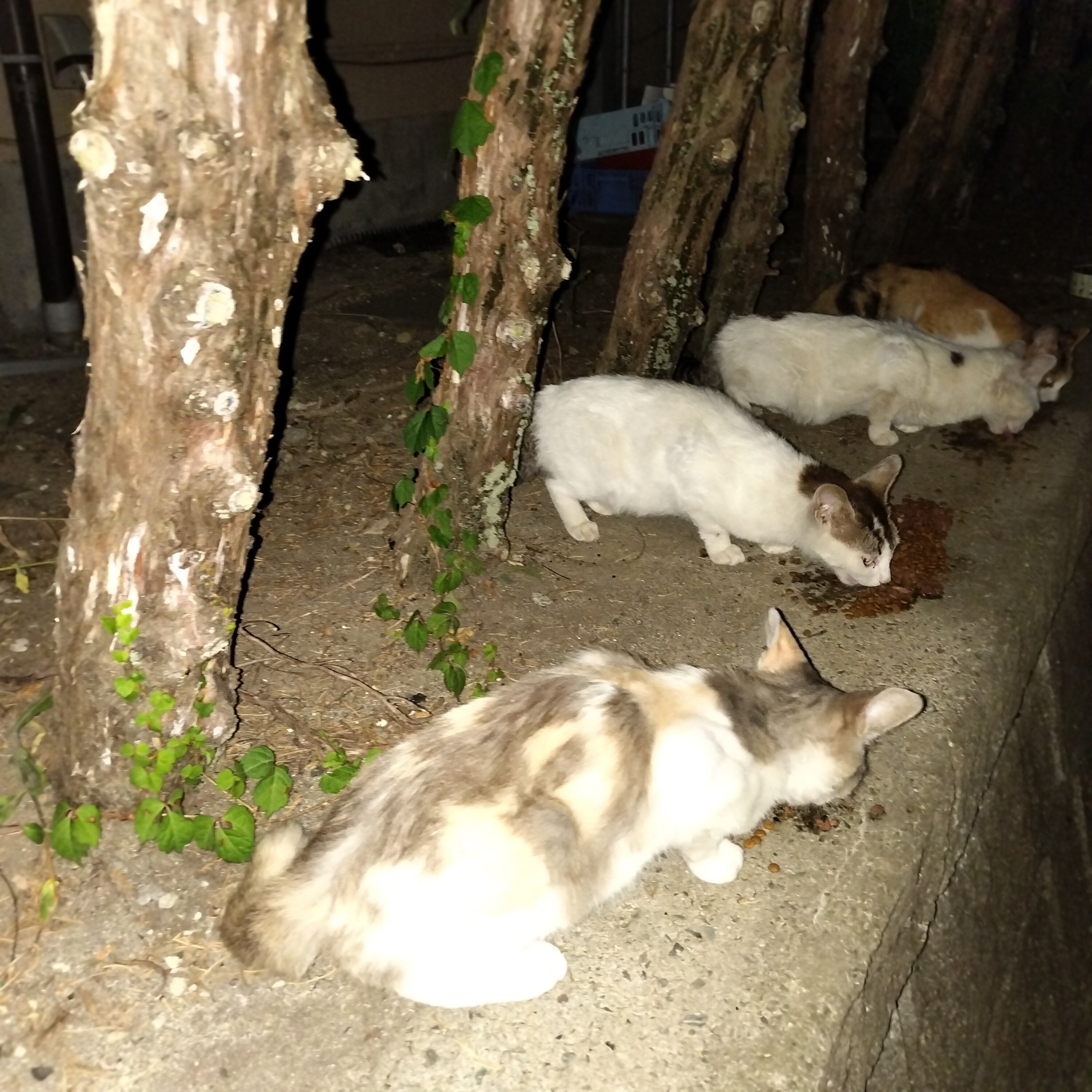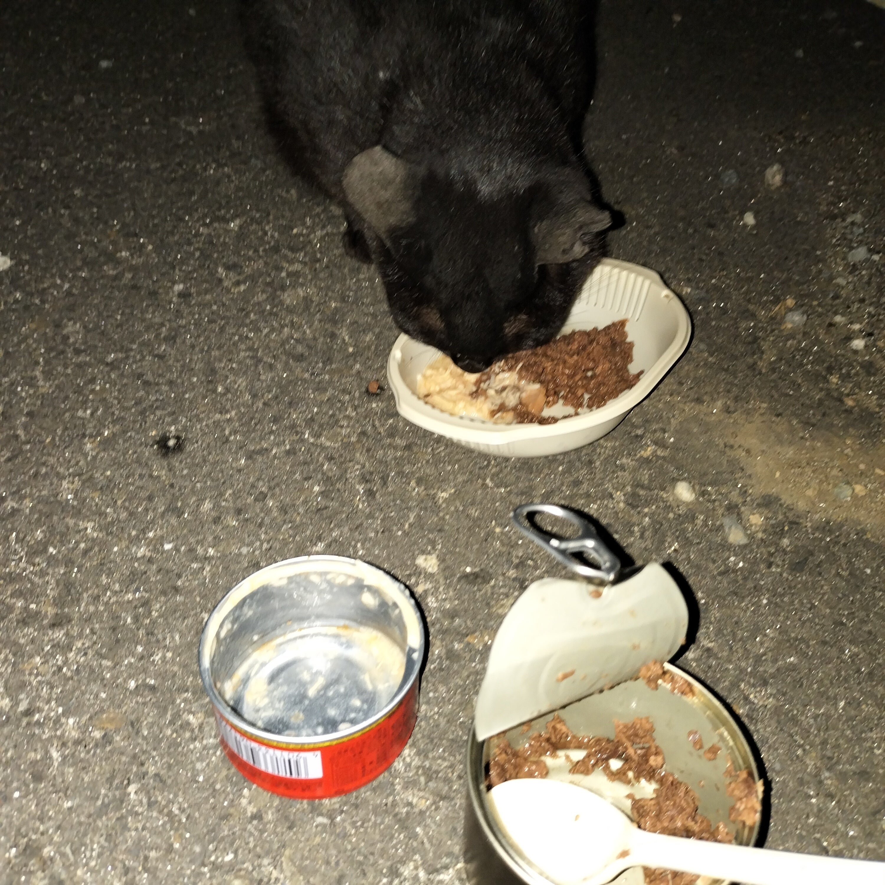 夜中の3時半になってしまいました… みんなお待ちかねでした。一昨日お向かいの奥さんにカリカリ一袋をお願いしました。この子達にあげて下さいと。それでも足りないようでした。缶詰も混ぜてあるので、缶詰が美味しかったのでしょ◉‿◉