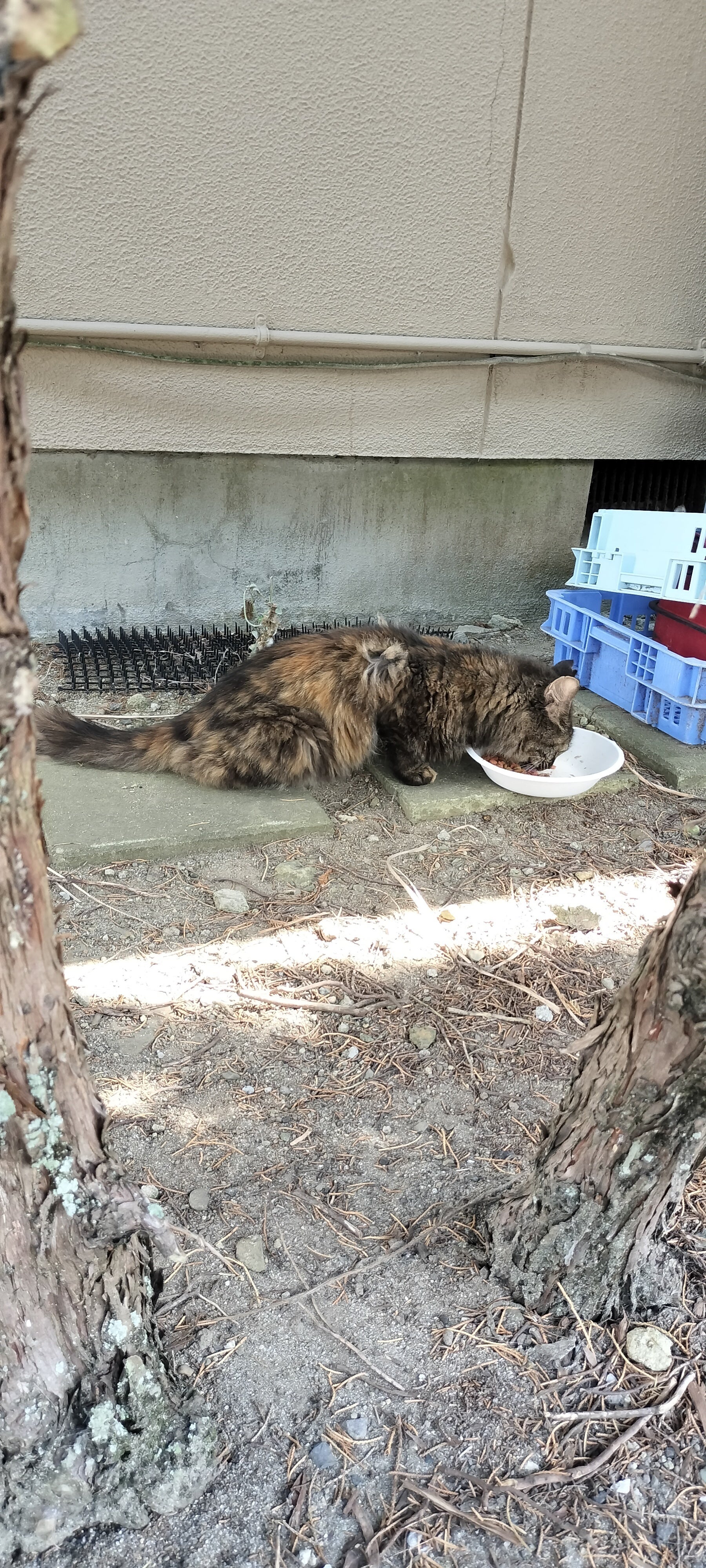 3人で話をしている内に、上の写真の猫がご飯を食べていました…おじいちゃんが言うには、発情したような泣き声で、子猫達を追いかけているようです。オス猫ではないのかなぁと言うのですが、なんだか、模様がサビ猫にも見えるのですが、メス猫に見えました。おじいちゃんは先週あたりに生まれたばかりの子猫2匹が何処からか出てきたそうです。裏の住宅の方からなんですが、母猫を見ていないそうです…