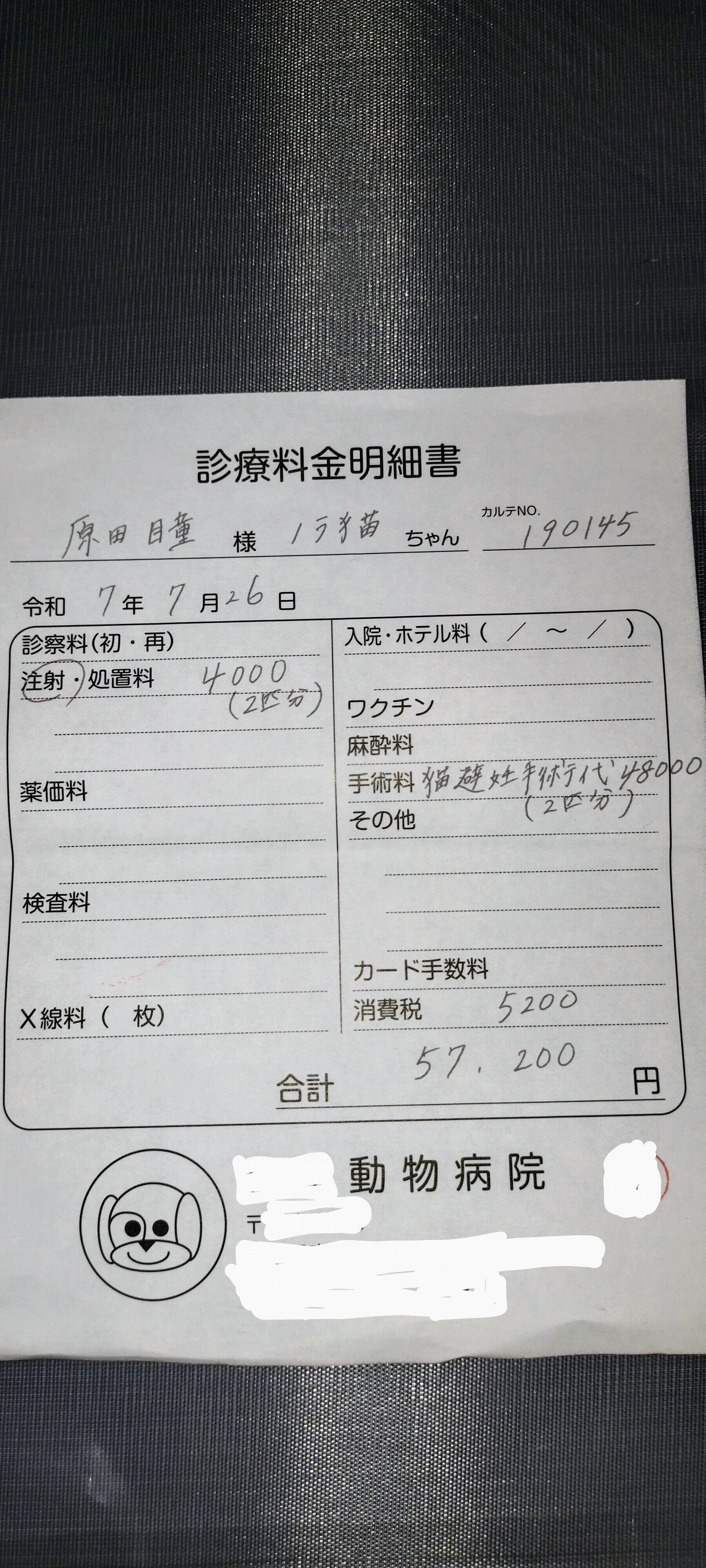 今回お世話になっている病院様の料金は一泊をしまして、メス猫が24.000円ですが、2週間効く化膿止めのコンベニアの注射が一匹2.000円追加になりました。2匹で57.200円でした。