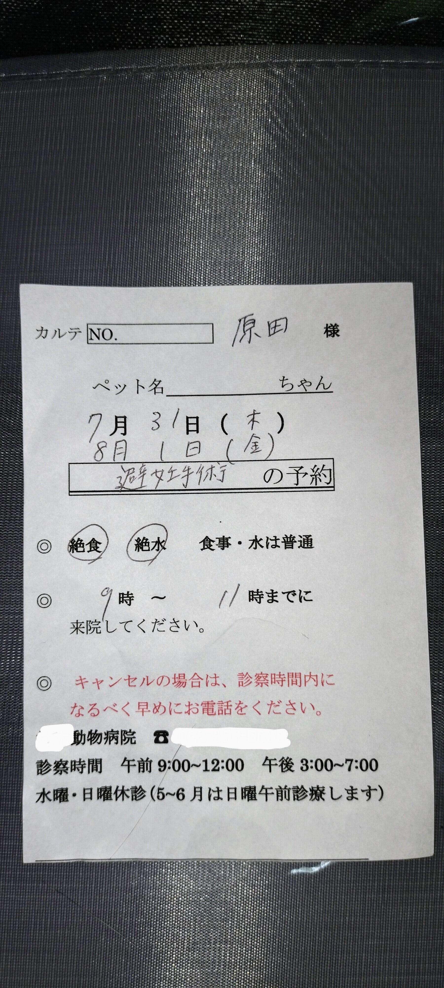 支援者様方のお陰様です。無事に2匹の女の子の避妊手術が終わりました。一泊してのお迎えになりました。残り3匹も全員女の子なのです。今月の31日、8月1日に予約を取りましたので、捕獲でき次第集まりました支援金で、手術をさせて頂きます。本当に皆様のご協力ご無ければ、5匹が又々次々と出産をしてしまうところでした。とても、とても支援者様方に感謝でいっぱいです。