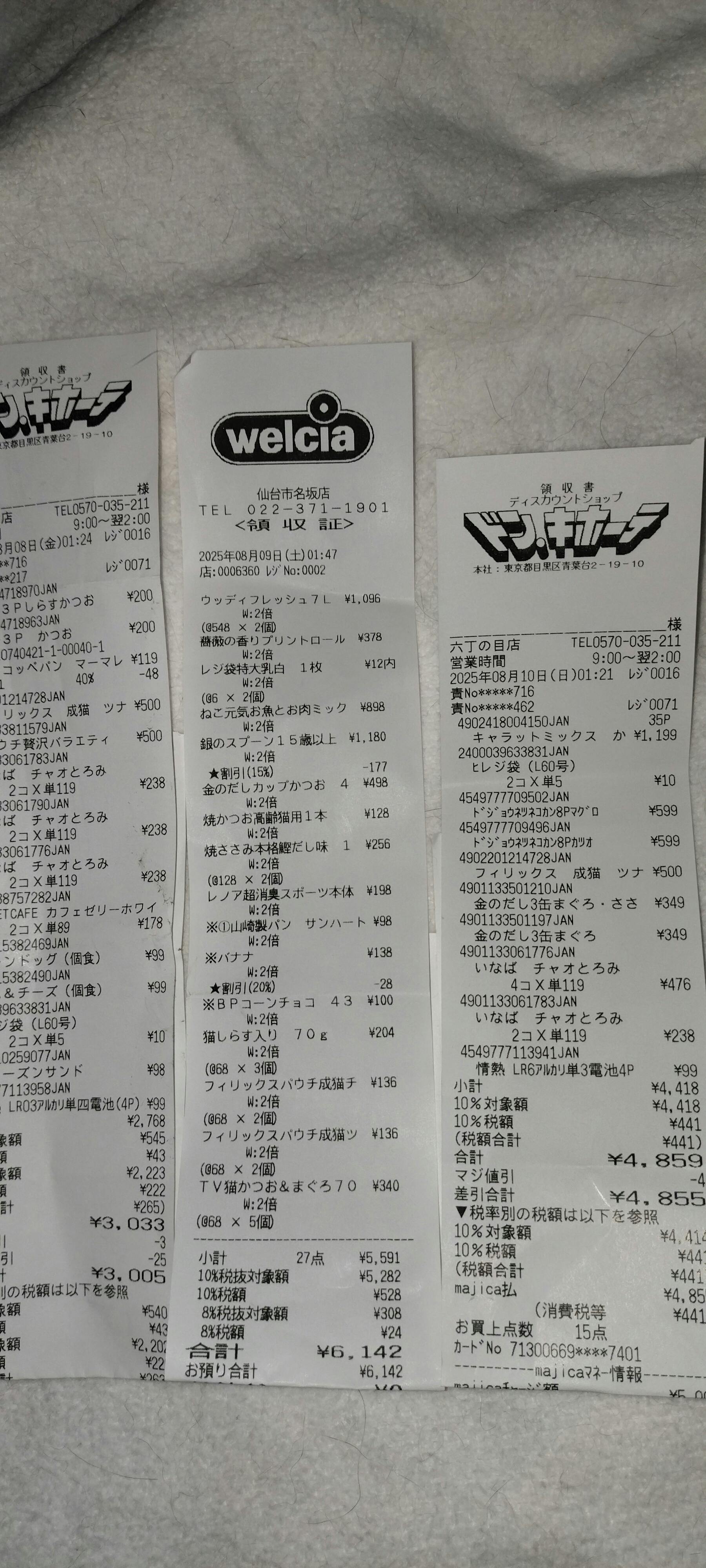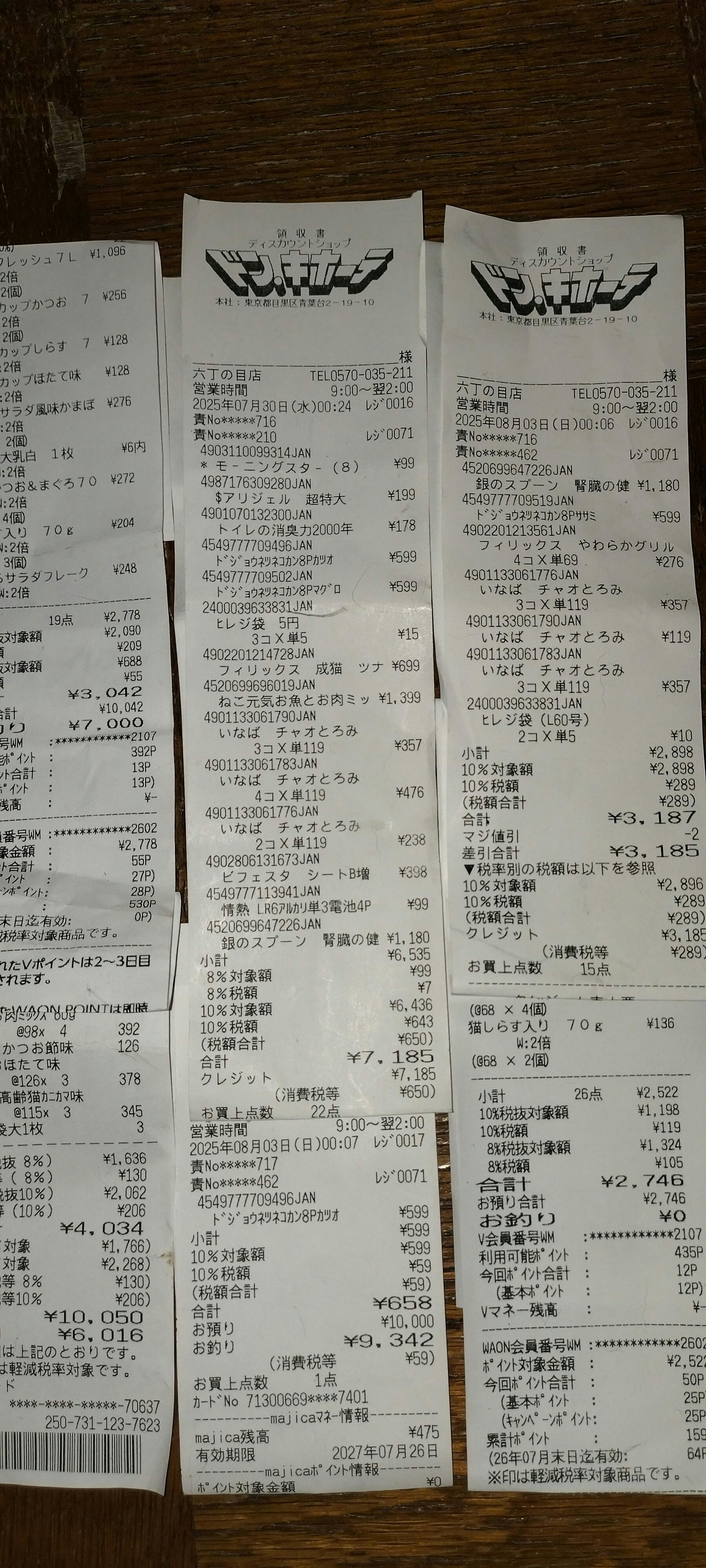 猫達の餌代の領収書と2匹の避妊の手術代の領収書です。本当に支援者様方に感謝で心がいっぱいです。ありがとうございます(✿^‿^)