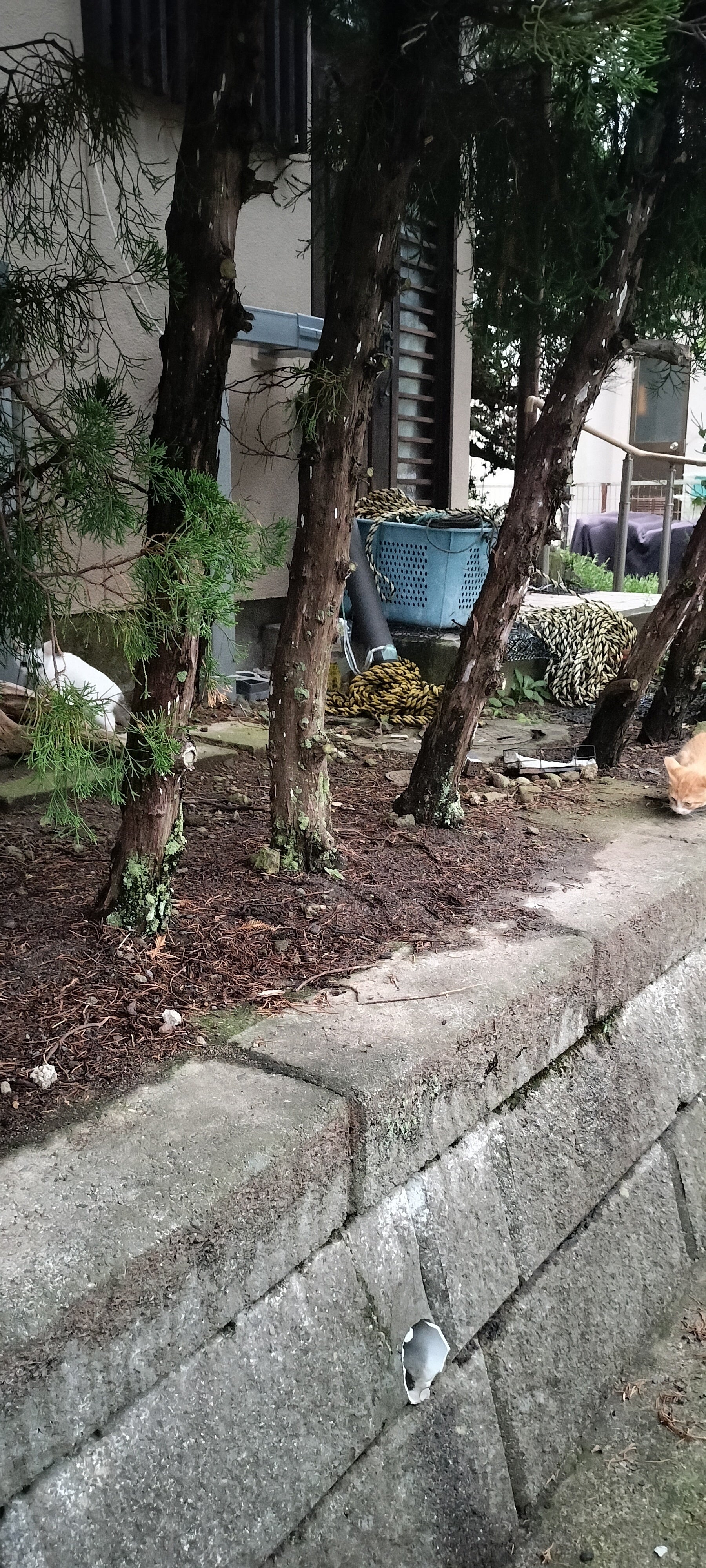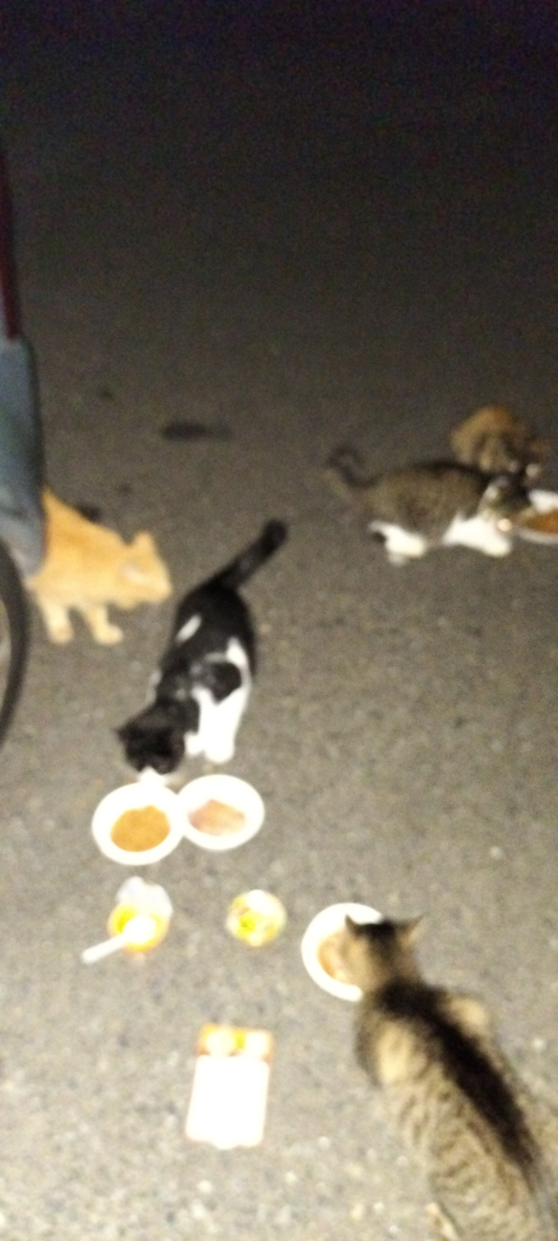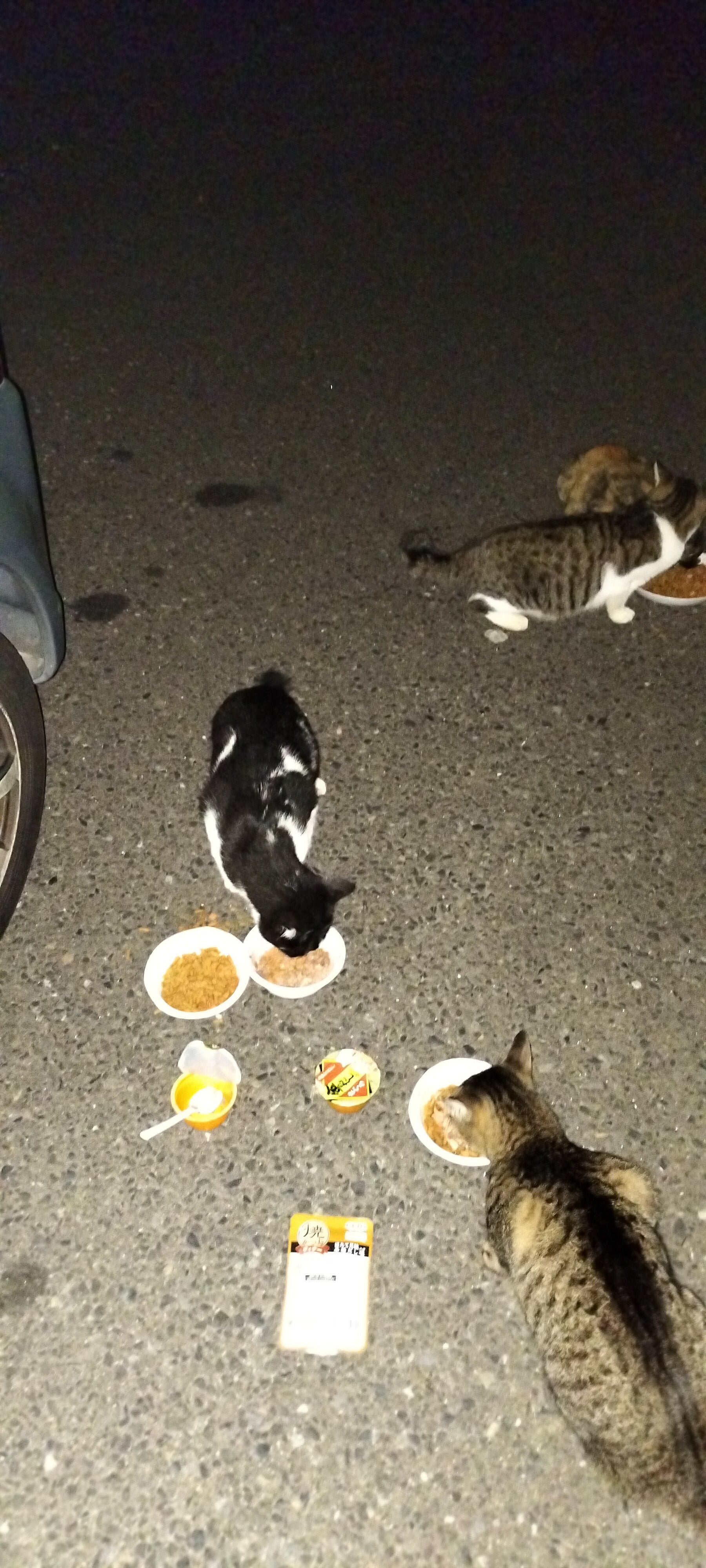 家の近くの猫達も2ヶ月位の子猫2匹もご飯を待っていました。茶トラは男の子でした。素早く逃げる白い子猫は多分女の子だと思います