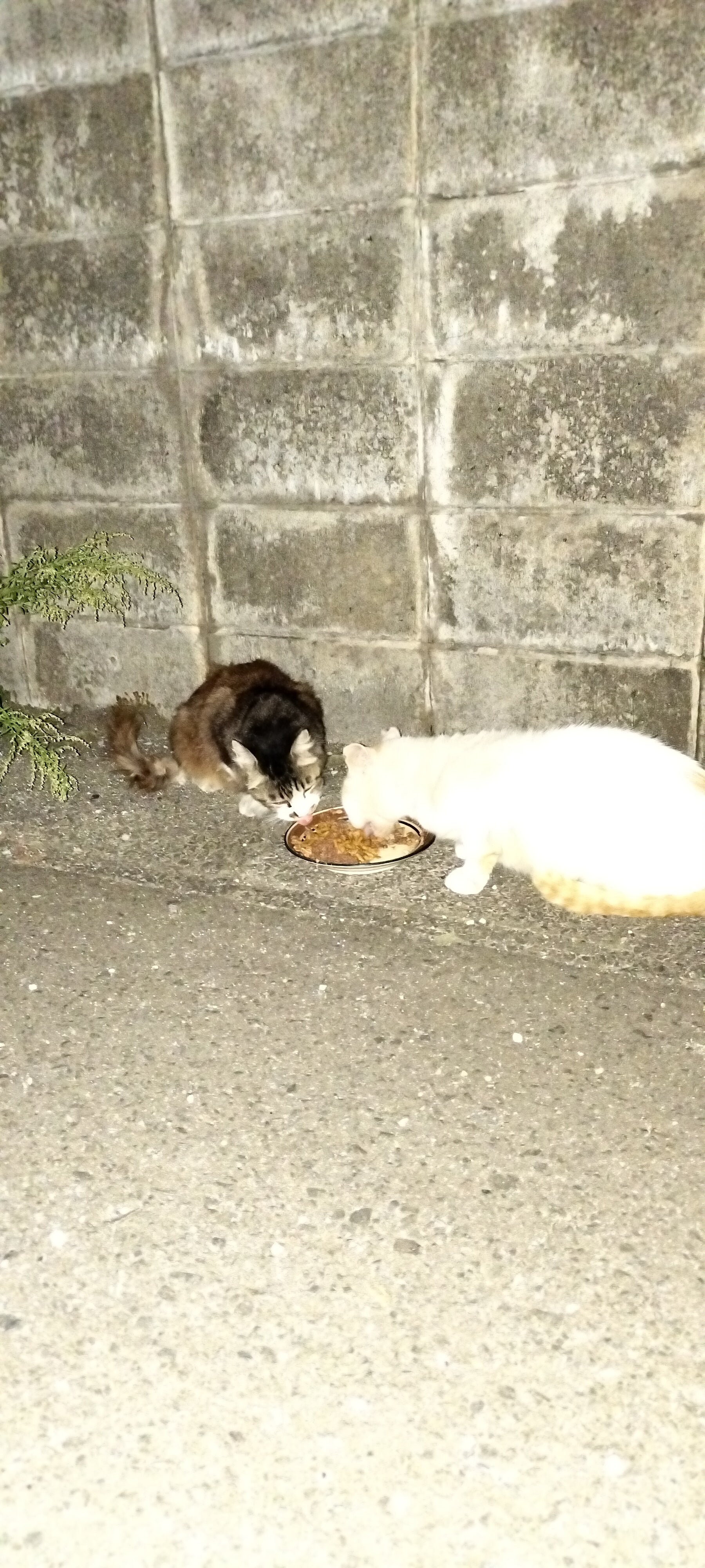 小さい子猫達も長毛の母猫も一昨日と昨日みんなでご飯を待って居ました。市営住宅と公園の猫達の後に来るので、朝方の3時半過ぎなのですが、相変わらず、お腹をすかせていふ感じでした…