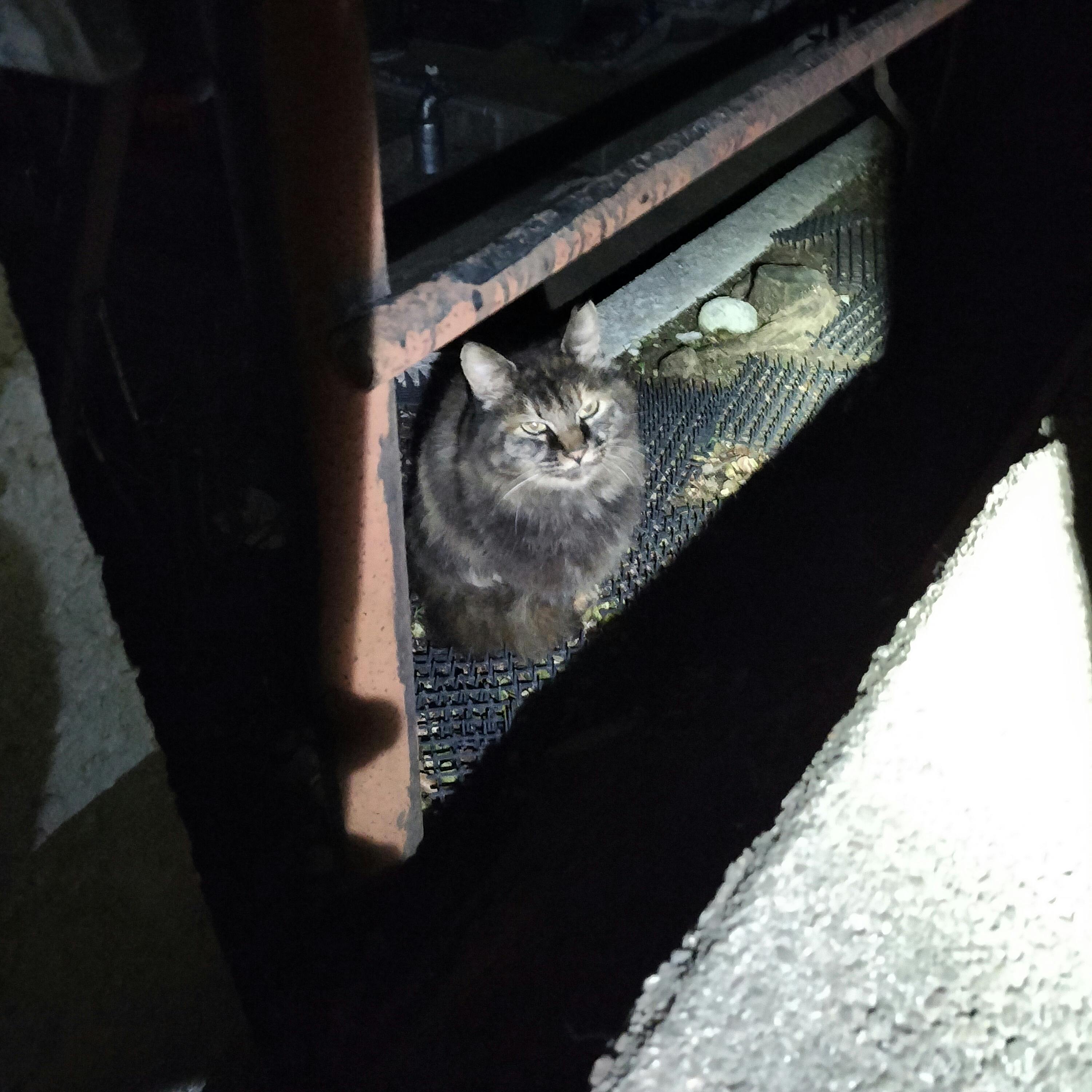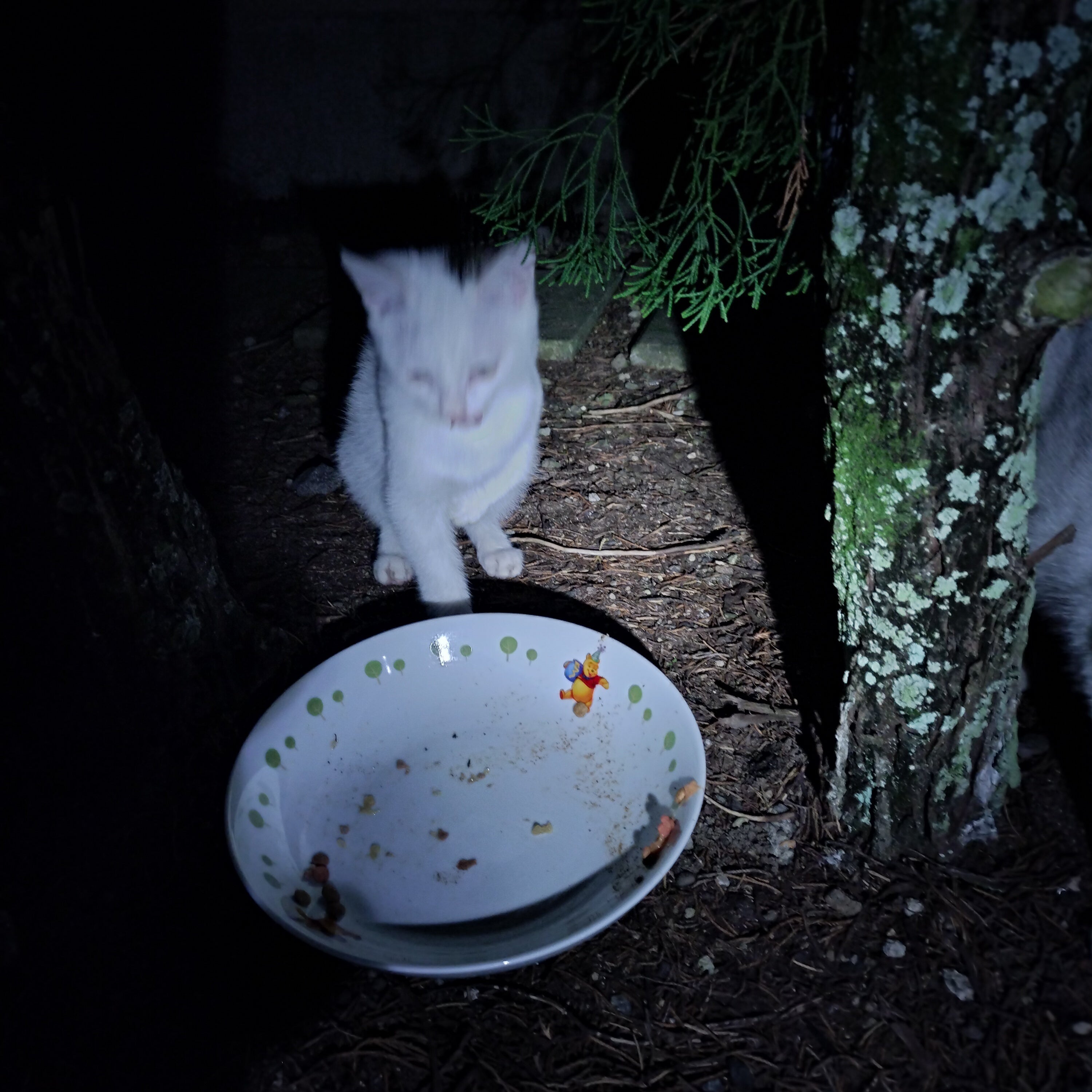 白猫と長毛の母猫の避妊の予定をしていましたが、長毛の母猫のミミがカットされていました。避妊を誰かがしてくれた様です。いつも暗闇の中なので、全然気が付きませんでした…