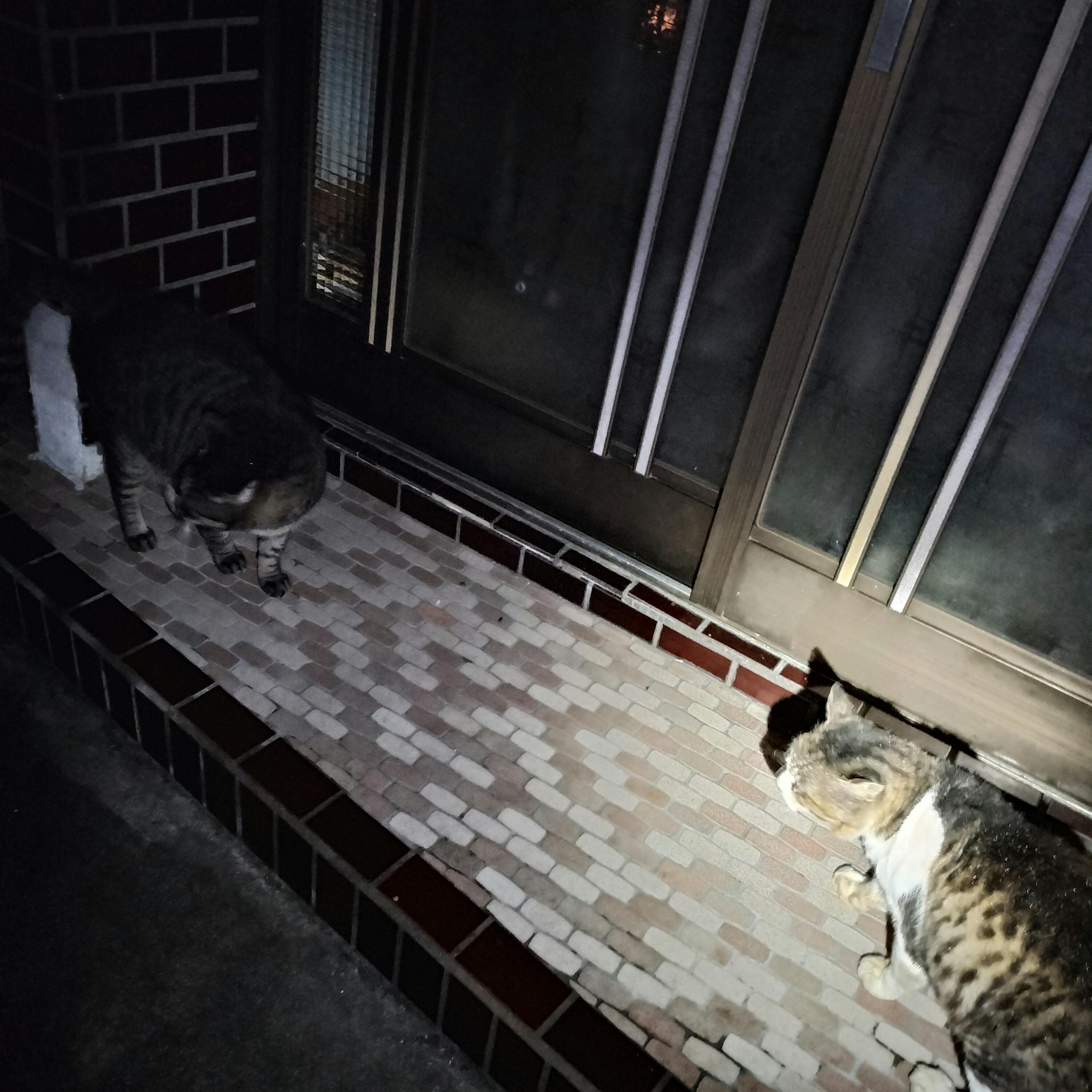 こっちでは2匹しか出てきませんでした…雨の中で待っているんです。本当に猫達は健気な生き者です。みんなが待っているから、目標か出来るのです。私も長生きしなくてはいけなくなりましたが、みんなを見捨てるわけにはいかないので、頑張って生きたいと思います。