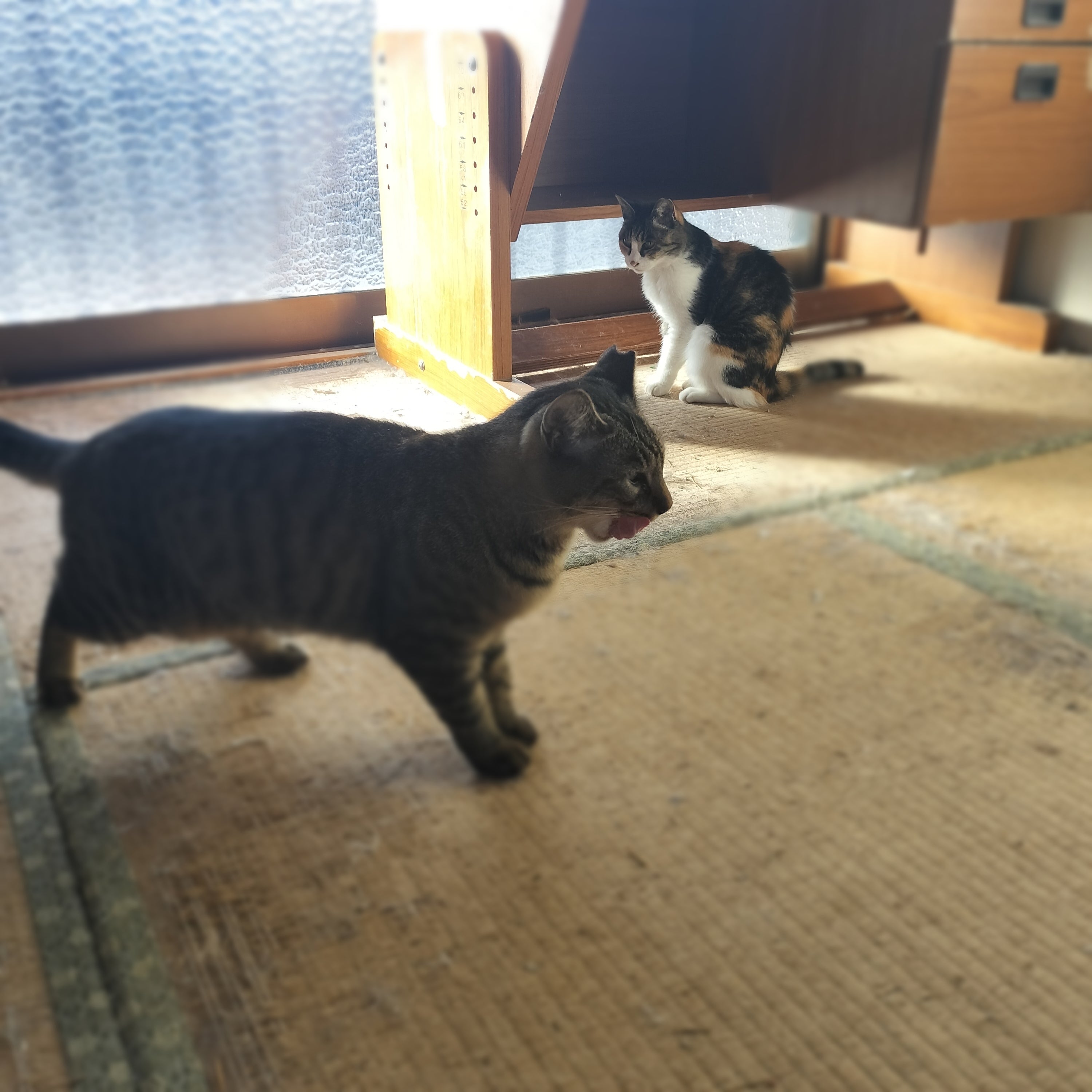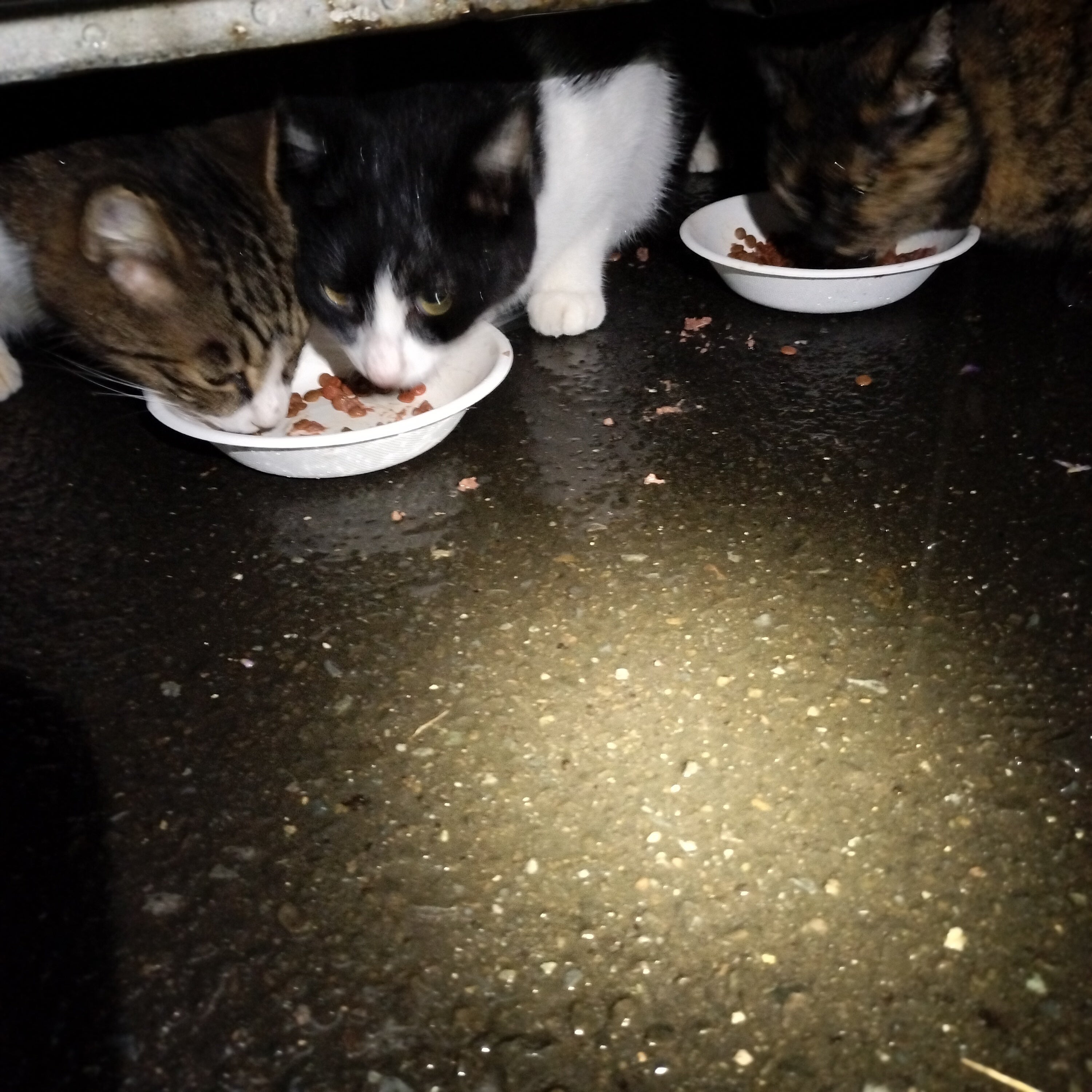 小雪はミケ姉ちゃんを威嚇しては、ご飯を横取りしていました…ミケ姉ちゃんはちび怪獣を怖がって遠くにいます。