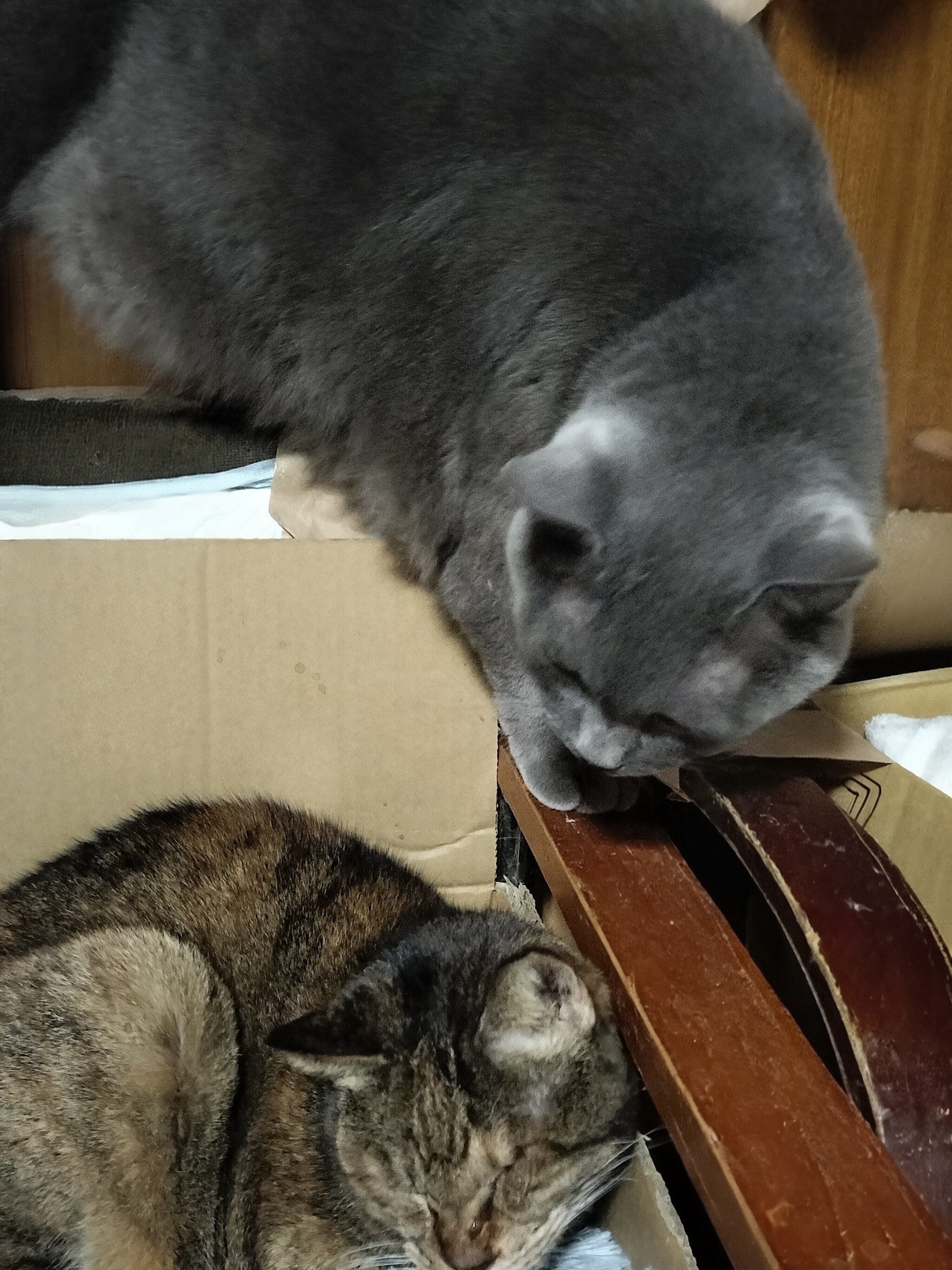 家の中の保護猫達もなぜだかみんな又風邪を引き始めました… 一匹引くと移ってしまうのが、いつもの事になりました。 片目のチャッピーもずっと下痢が止まらなくて、便がほとんど水に近い状態でした… 昨日からご飯も食べ無くなりました。 りく君と他の猫達も食べてすぐ吐くのですが、それでもみんな食欲はあるのですが、チャッピーだけは食欲がまったくなくなってしまいました。 りく君が心配そうにチャッピーに近づいて来ました。
