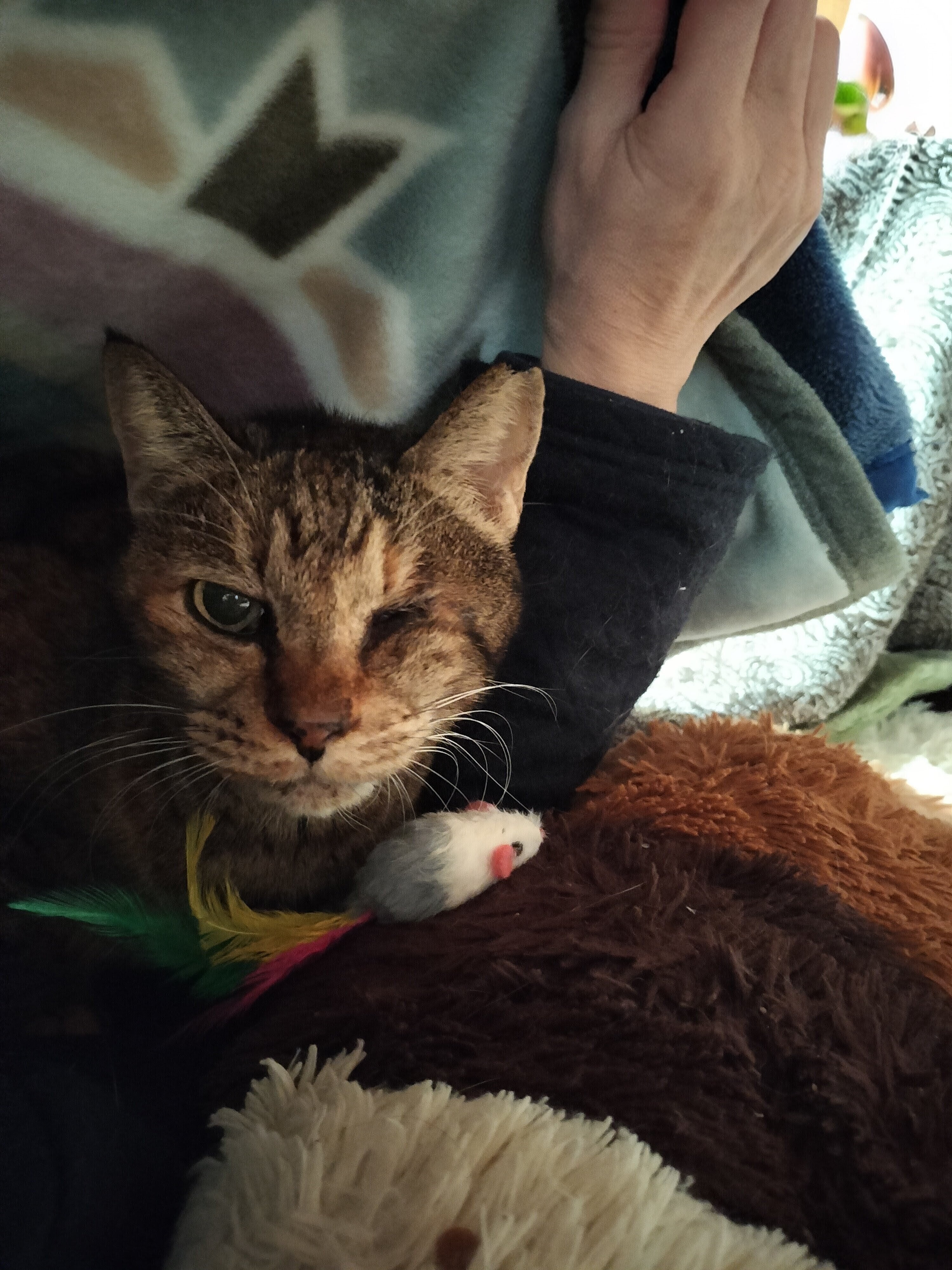 お布団の中で寝てくれました。ネズミのオモチャも4つ買ってきましたら、少し遊んでいました。今日は薬を全部吐いてしまいました…