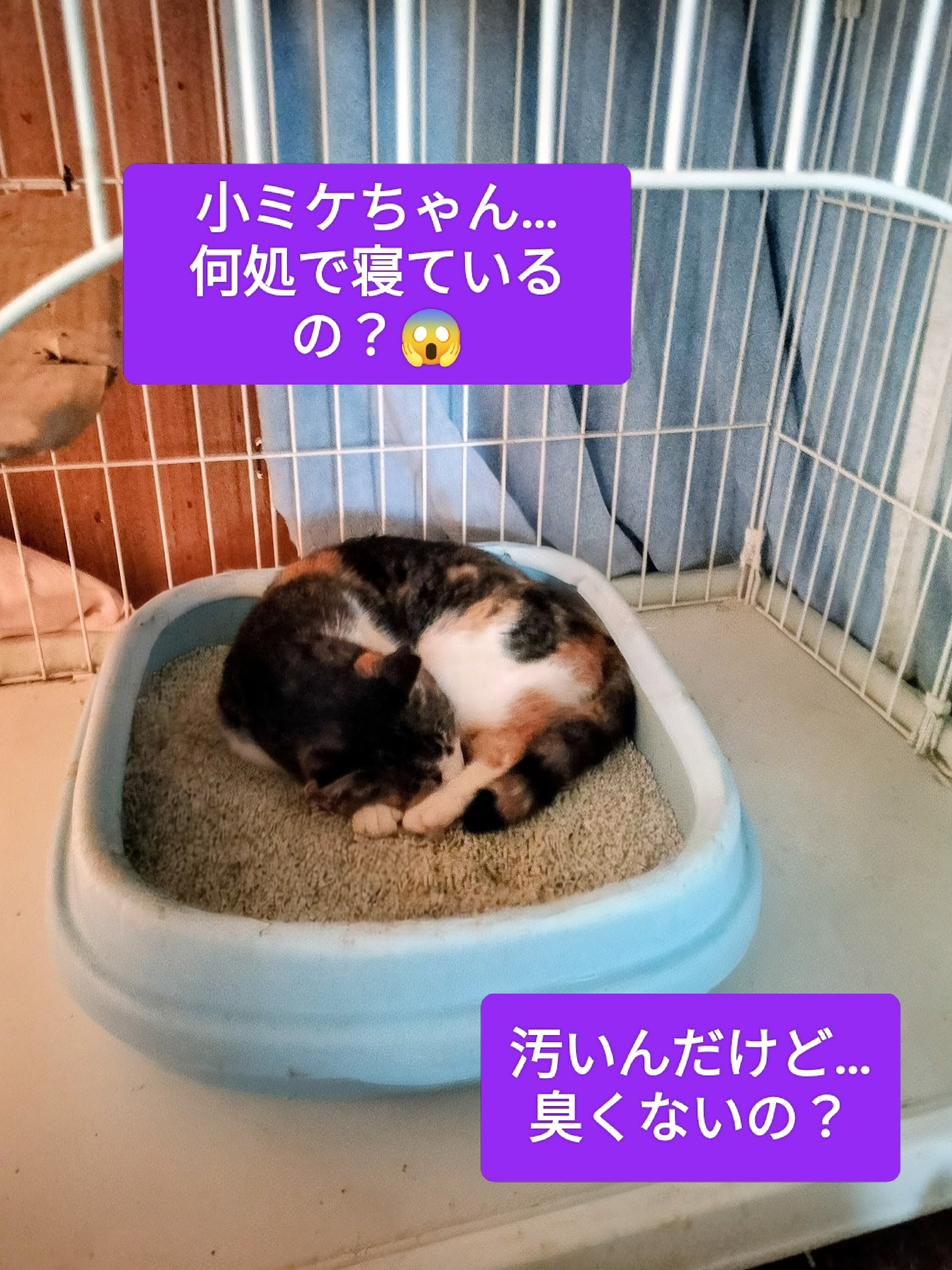 チャッピーの為にトイレをケージに入れたのですが、なぜだか小ミケちゃんが寝てました… 姿か見えないと思ったら、くっさい~トイレの中でした…