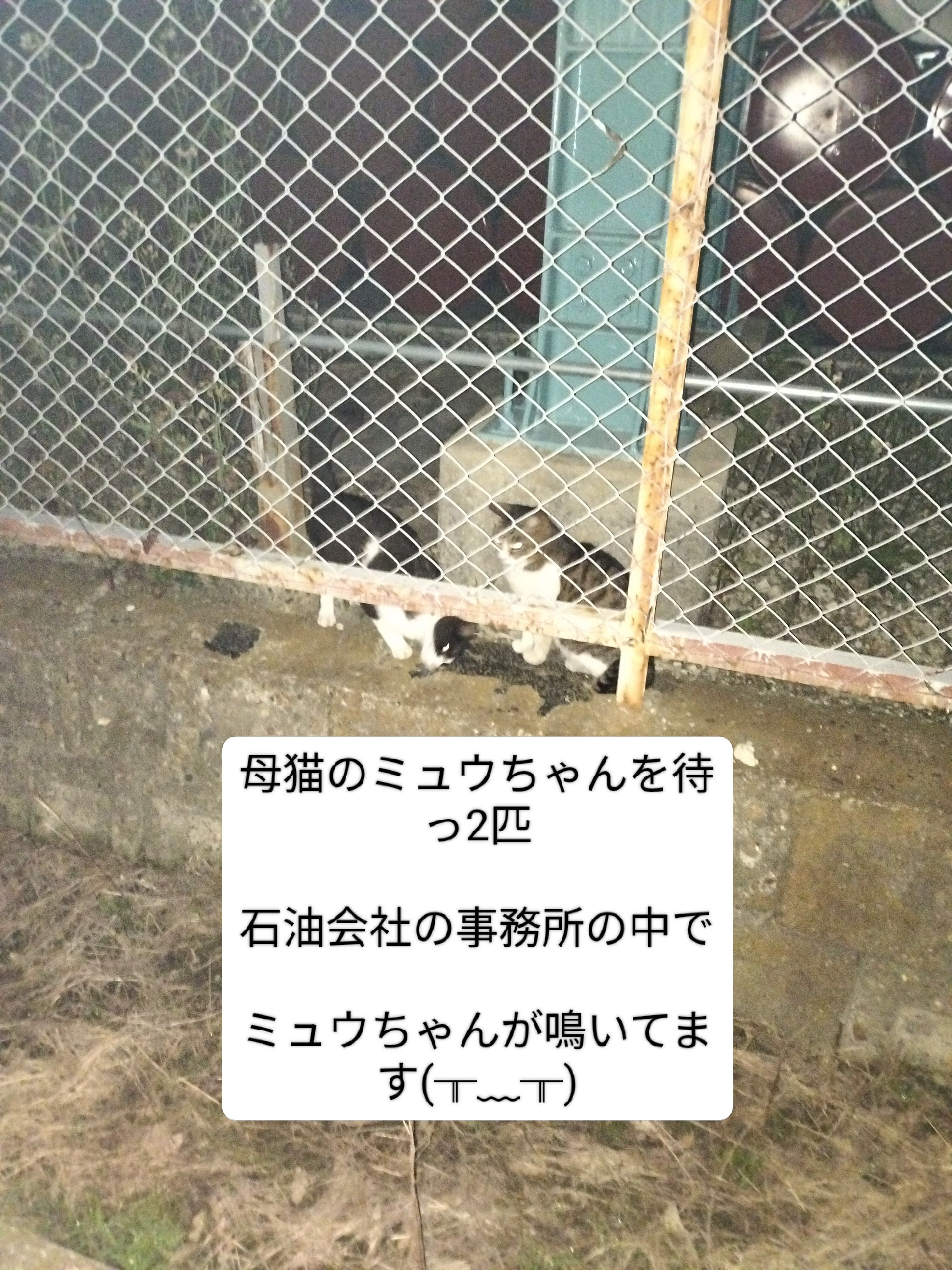 支援者の方々いつもありがとうございます。2日前に4匹のうちのミュウちゃんが出てきてませんでした。探しては読んでも返事がありませんでした。公園の子みたいに何処かの建物に入り込んだのではないかとずっと呼びかけてましたが、やっと3日目の今日に声を出しました。なんとも困ったことに石油会社の事務所の中から声がしました(╥﹏╥)事務所は朝方の3時半頃には開くので、3時半まで1時間半ありますが、待ちます。絶対に出します。今日の天気で32まで上がってしまっているのに、飲まず、食わずで本当に可哀想です。おじいちゃんの所に行きましたら、昨日から車がありませんでした。今日はおばちゃん猫と子供が3匹だけでしたが、おじいちゃんの家にはまあ君と言うオス猫が一匹いるのです。今日の32度の天気の中、窓も空いてないですし、ケージに閉じ込められているし、死んでしまうではないかと凄く心配になりました。夜中の1時ですが、おじいちゃんに電話を掛けましたが、出ませんでした。30分後におじいちゃんからメールが来ました。知り合いの家に泊まってますと、まあ君は大丈夫です。私はすぐに電話をしました。お昼頃に家に戻って見たら、大丈夫だったとのことです。 なのに窓も何も空いてませんでしたಠ_ಠ なので、出かける時は教えて下さいとお願いしました。私がまあ君を預かりますのでと言いました。 去年私の家から窓に付けられるエアコンをあげました。なのに電気代が払えないから、全然付けてなかったのです。おじいちゃんもずっと我慢していて、具合が悪かったと言うのです。私が何のためにエアコンをあげたのか、付けてなかったら、おじいちゃんのまあ君は熱中症になって死んでしまうよ〜と人間は外で涼しめるけど、猫は閉じ込められているので、逃げられないんですよと散々説得したのです。電気代が払えないのなら、エアコンの分を私が払いますと言ってきたのですが。今年もおじいちゃんは暮らしがせっぱつまっているので、エアコンを付けないのかも知れません…中にいるまあ君が心配です。人間は65歳を過ぎると暑さを感じにくくなるとテレビで検証しました。なので、夏になると家の中で、エアコンを付けないで寝てる老婦がよく亡くなるニュースを見ます。去年仕事で35度の真夏に車の窓を締め切って、エンジンを止めて中に小型犬を入れていた老婦と遭遇しました。小型犬はベロを長く垂らしてゼイゼイしていました…すぐに老婦を呼びまして、せめて窓だけでも開けてあげて下さいとお願いをしました。そうした、おばちゃんが車の中に入って、ワンちゃんを抱っこしただけでした。窓も開けないまま座っているのです…まったく暑がらないのです。老婦に飼われる動物達も本当に気の毒に感じました。これ以上その人を責めることも出来ないのです…