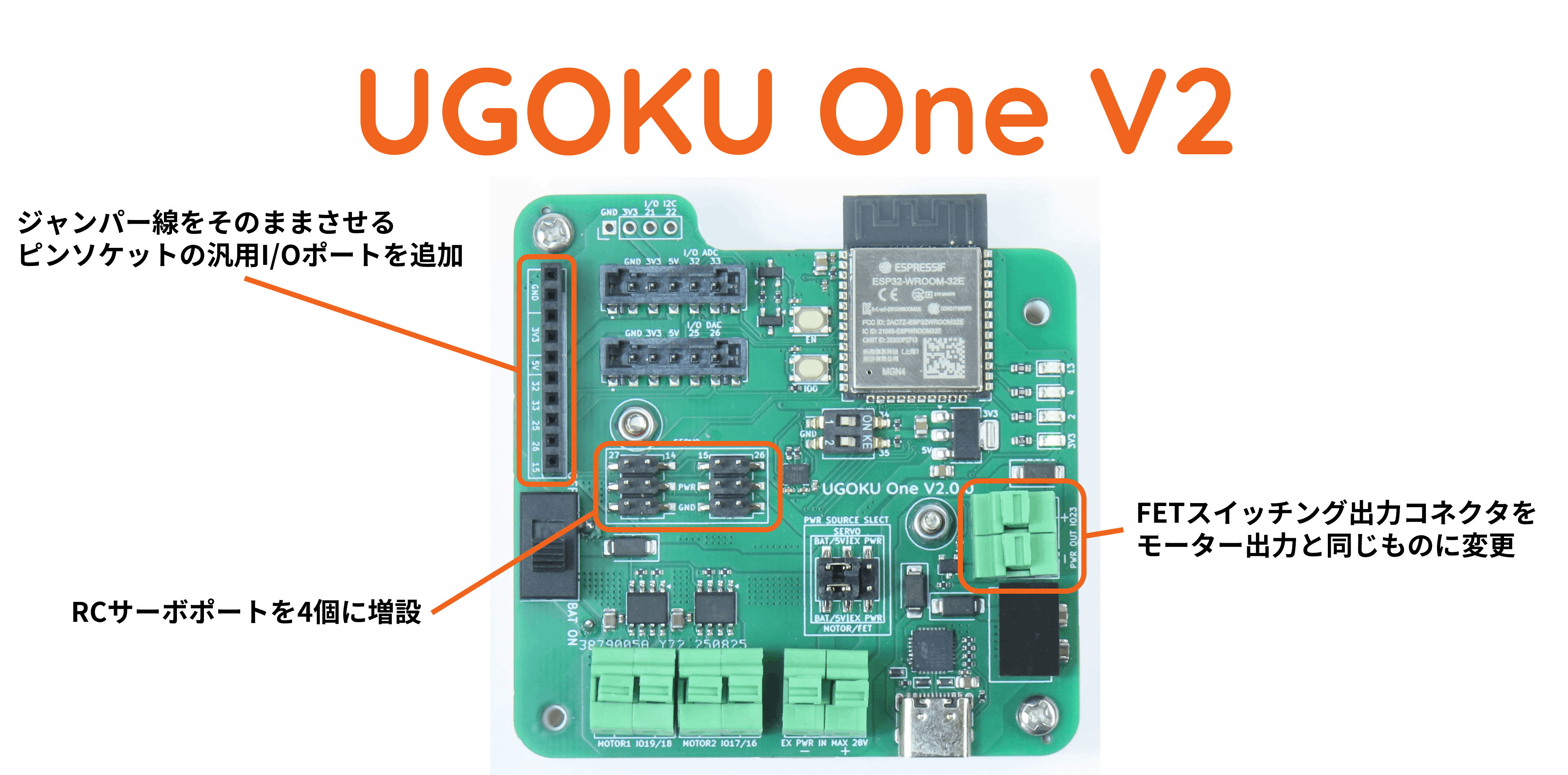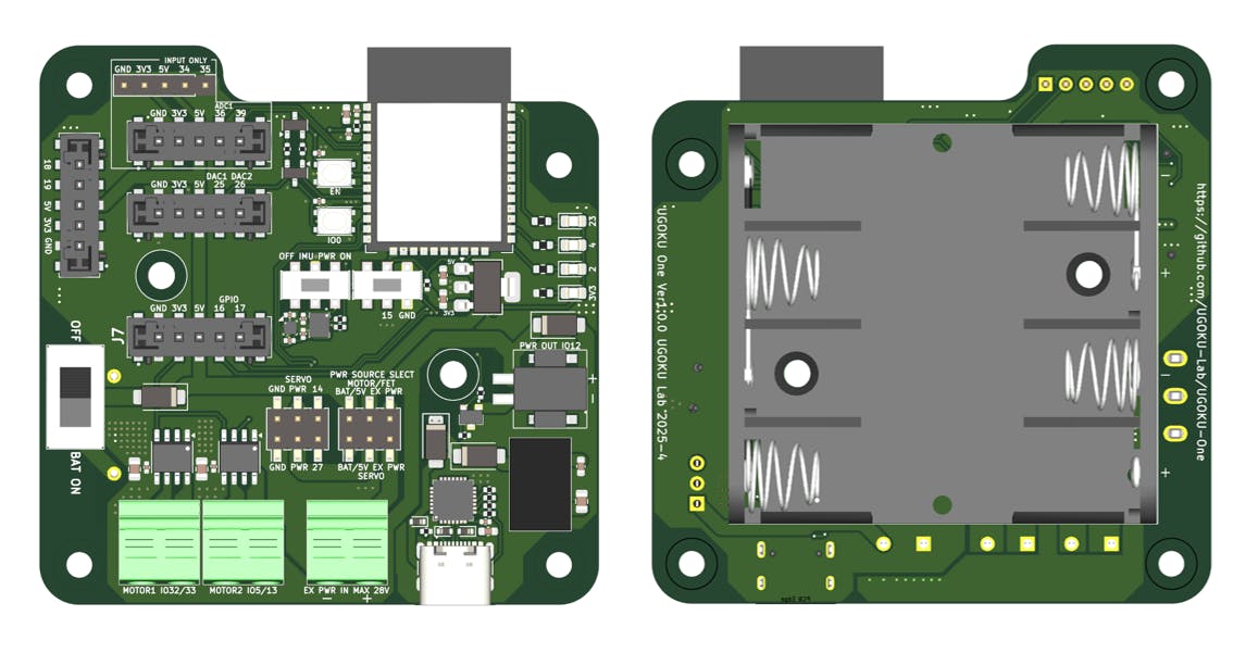 「UGOKU One」はDIYや電子工作、ロボット開発などによく使うDCモーターとRCサーボモーターをすぐに動かせるワンボードのデバイスです。