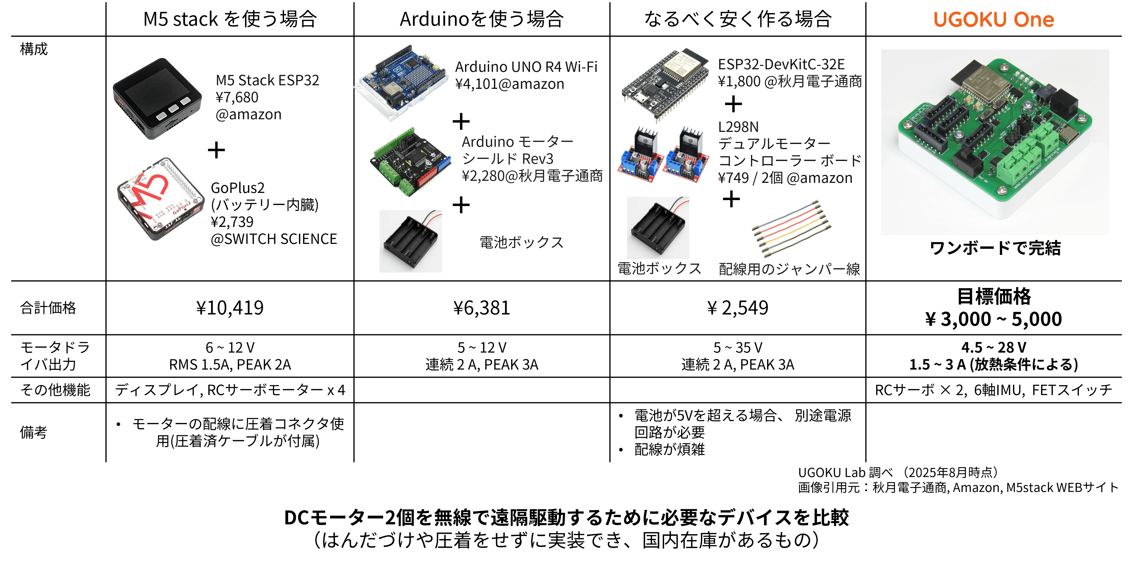 他の既存のデバイスを用いる場合、マイコンボードやモータードライバ、バッテリーなどを個別に用意し組み合わせる必要があるため多くの手間や時間、費用がかかりました。