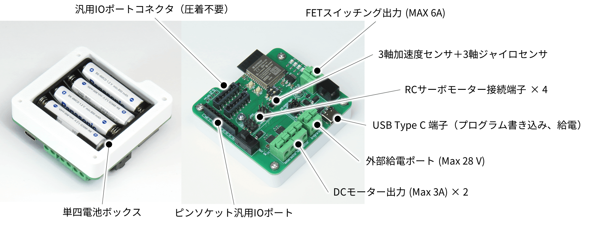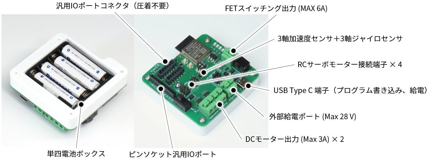 無線通信機能を搭載したマイコン(ESP32)を搭載することでスマートフォンなどから簡単に遠隔操作を行うことができます。センサーなどの入力に使える汎用I/Oポートや、リレーなどの操作に適したFET出力、ロボットの姿勢制御や自己位置推定に使える加速度・ジャイロセンサーも内蔵しました。