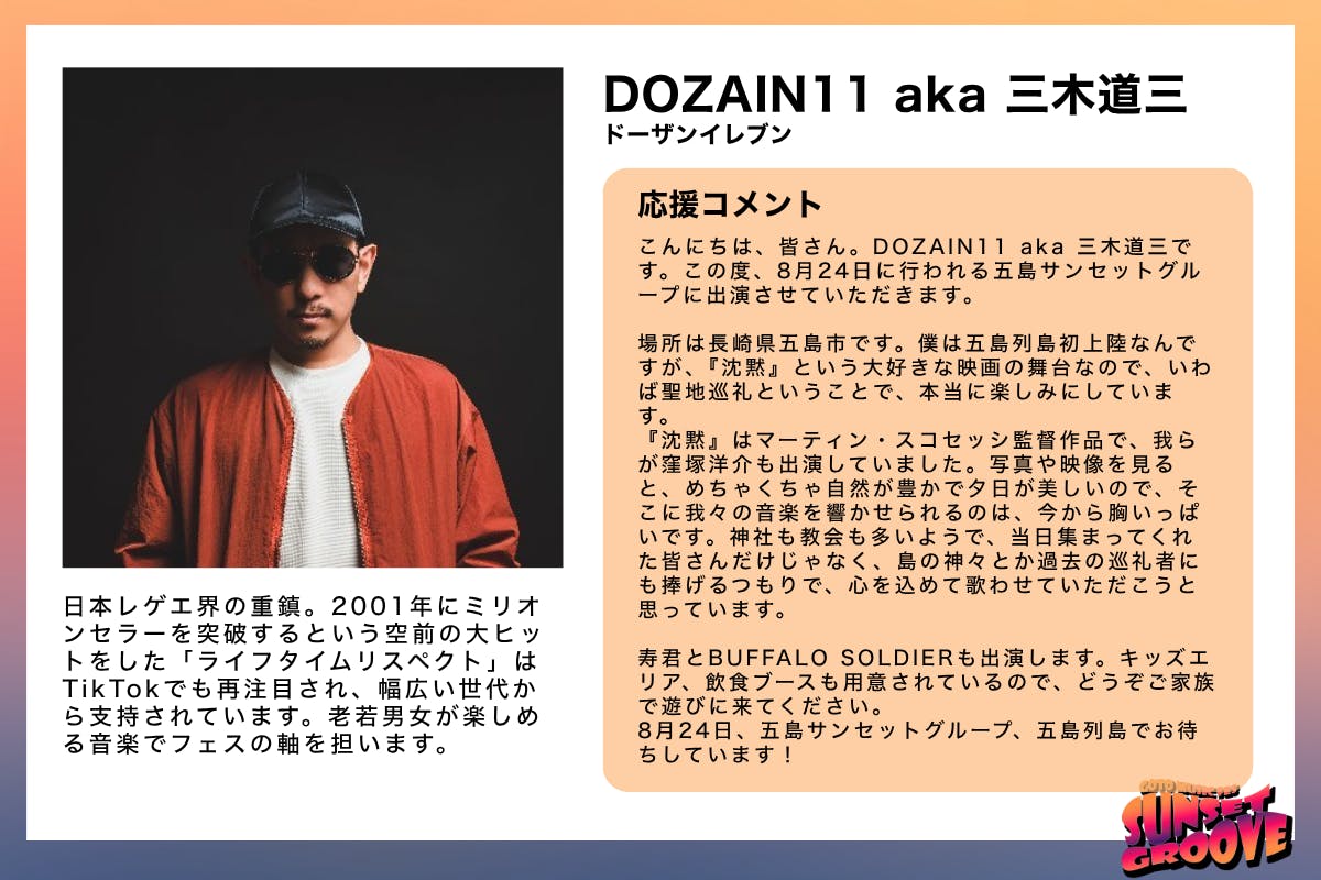 本イベントには、DOZAN11 aka 三木道三や寿君をはじめ、全国で活躍するレゲエ・アーティストたちが五島に集結します。