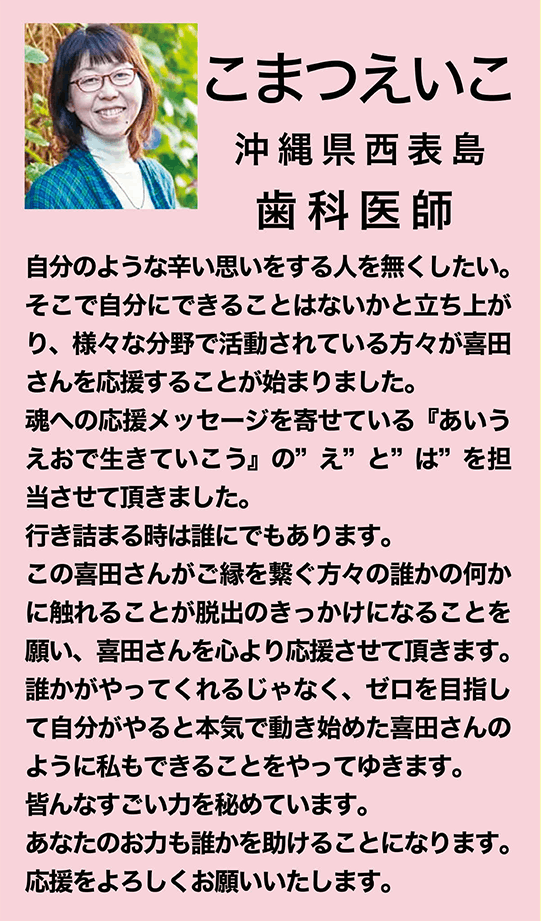 喜田さんの行動力、大切な想いに感動しました!一人でも多くの若者が救われるきっかけとなりますように。応援しています。