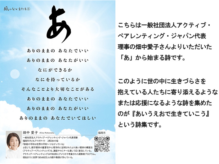 心の詩集《あいうえおで生きていこう》に詩で参加してくださる人も募集しています。